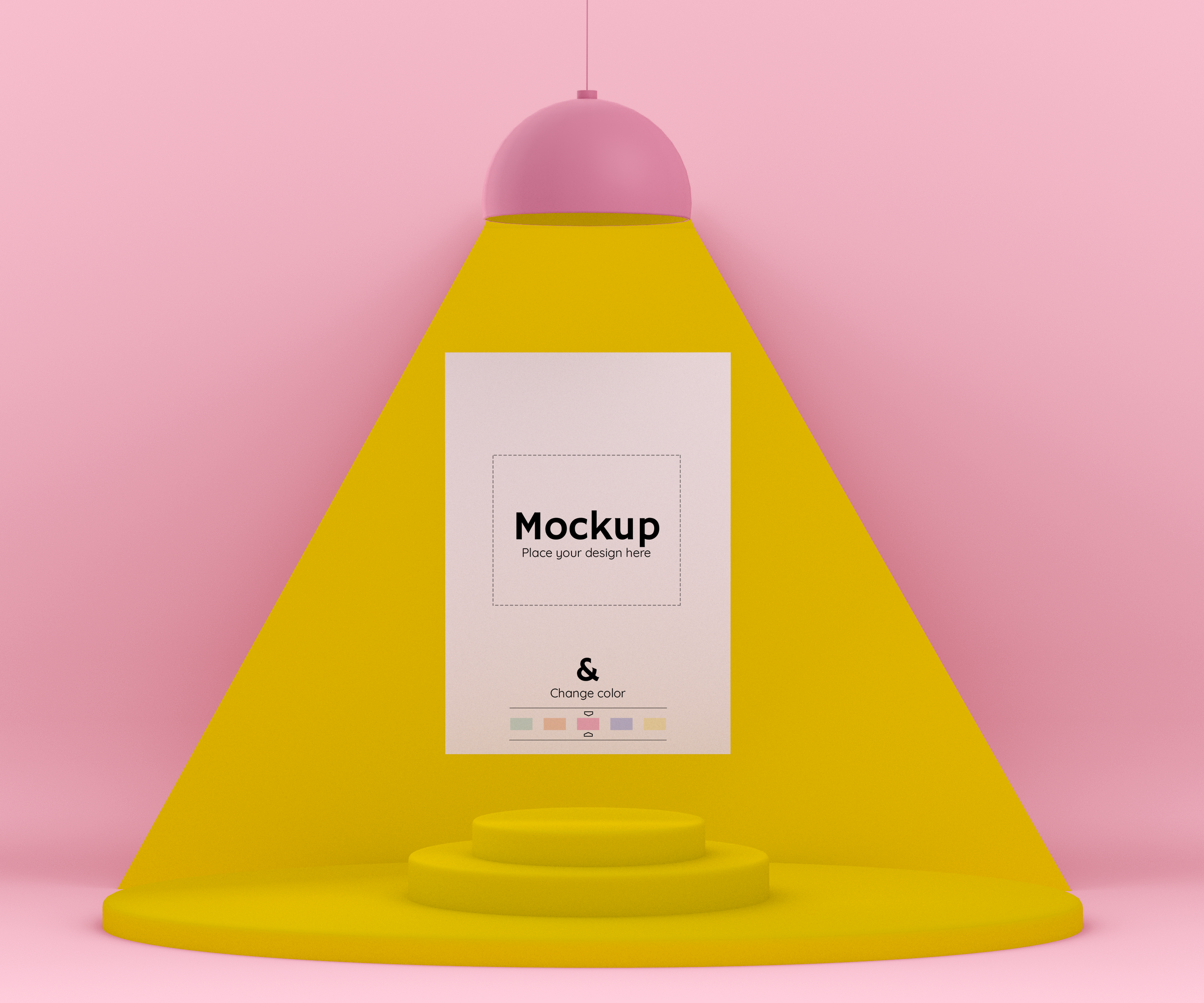The mockup image features a minimalistic modern setting, with a bright yellow spotlight illuminating a white poster. The backdrop is a soft pink gradient, enhancing the overall aesthetic appeal. A dome-shaped pink light fixture hangs above, casting a focused beam on the poster centered on a yellow platform with steps. This mockup can be used for advertising designs, promotions, or announcements. Utilize our mockup generator to create eye-catching visuals and share your innovative designs on social media today!