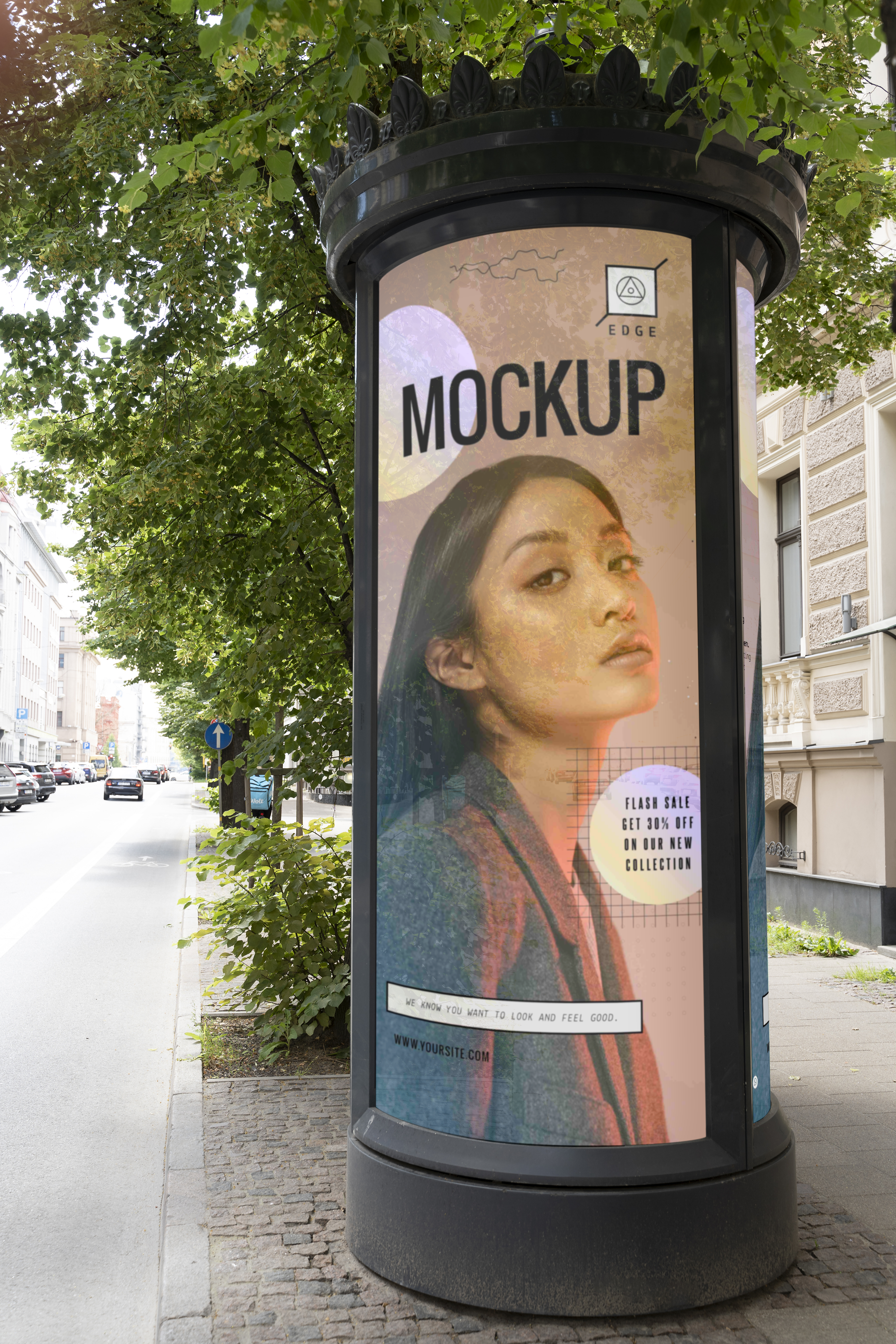 The mockup image features a cylindrical street advertising billboard with a fashion poster, set against an urban background with trees and a road. The main object displays a stylish design, incorporating a model's photo and modern graphic elements like geometric shapes and textured backgrounds. Ideal for advertising new fashion collections or upcoming sales. Use this mockup generator to create eye-catching designs and share them on social media to boost your brand presence!