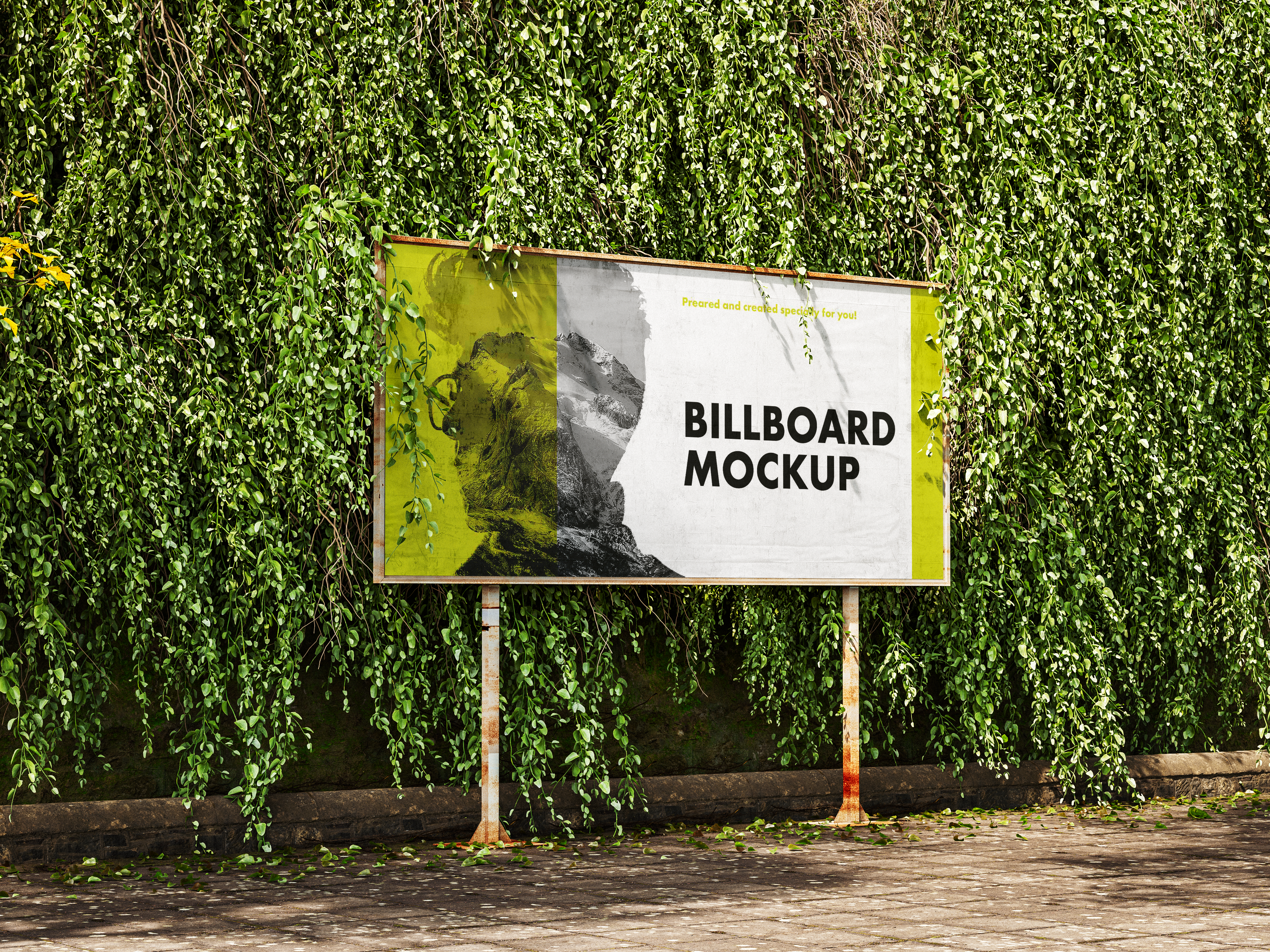 The mockup image displays a billboard set against a backdrop of lush, cascading greenery, creating a vibrant and natural setting. The billboard, mounted on two rusted poles, features a clean design with a grayscale image on the left and a bright yellow accent on the right. The design is clear and eye-catching, perfect for outdoor advertising. Use this striking mockup to showcase your brand creatively and effectively. Try our mockup generator now and share your stunning design on social media!