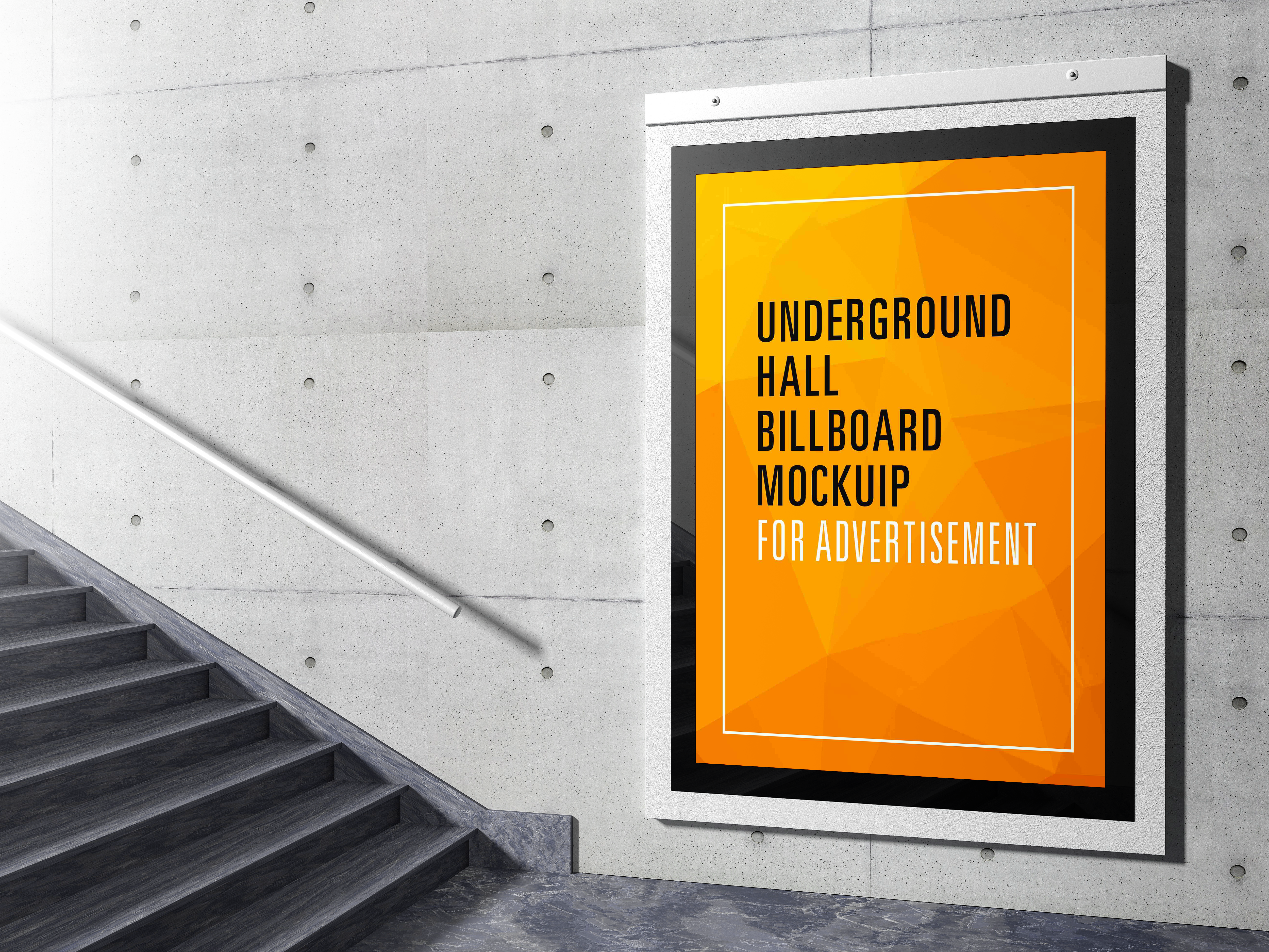A billboard with a bright orange and yellow design and text "underground mall template for advertisement" mounted next to a staircase in a modern concrete building.