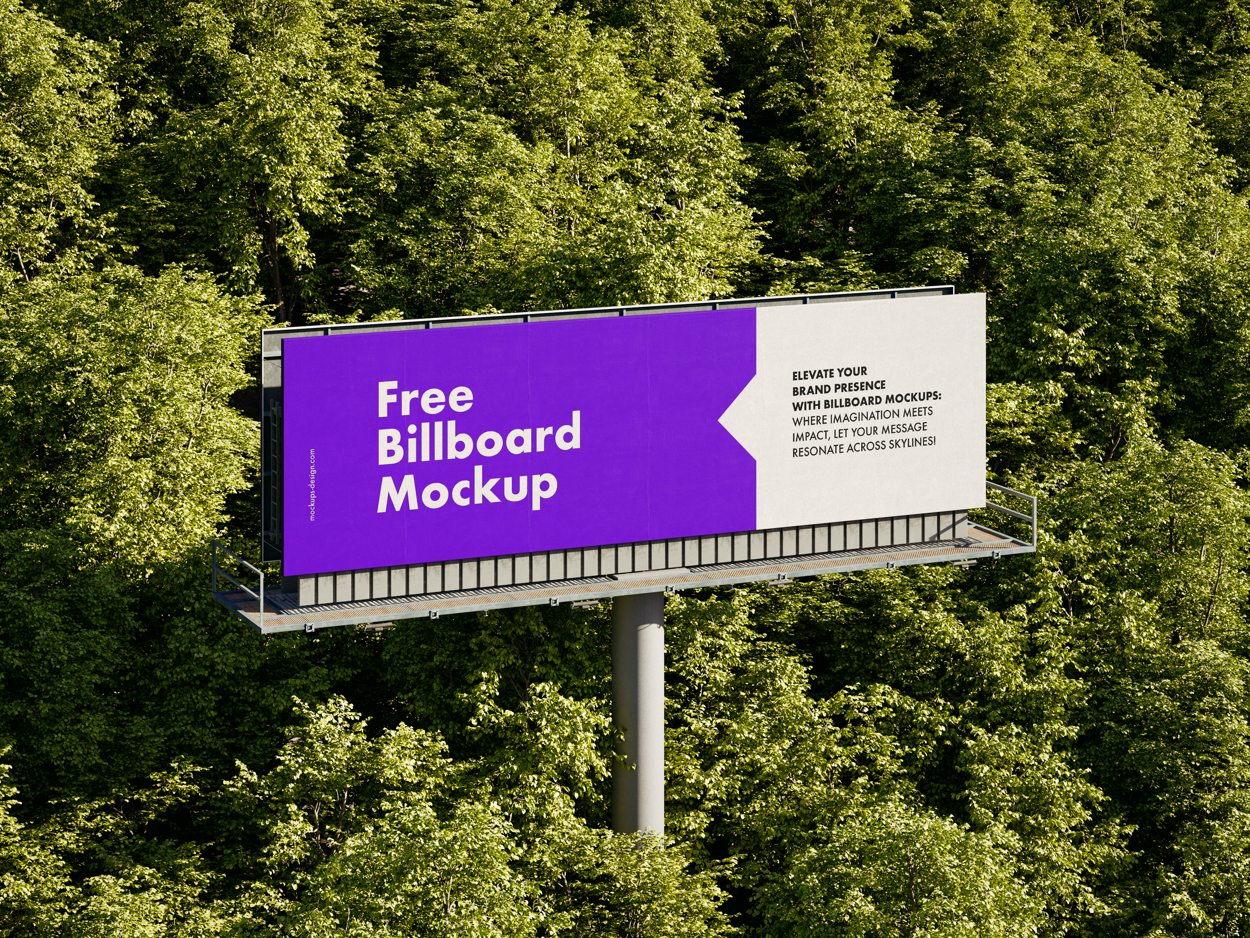 A billboard with a purple background reading "free billboard template" stands amidst green treetops.