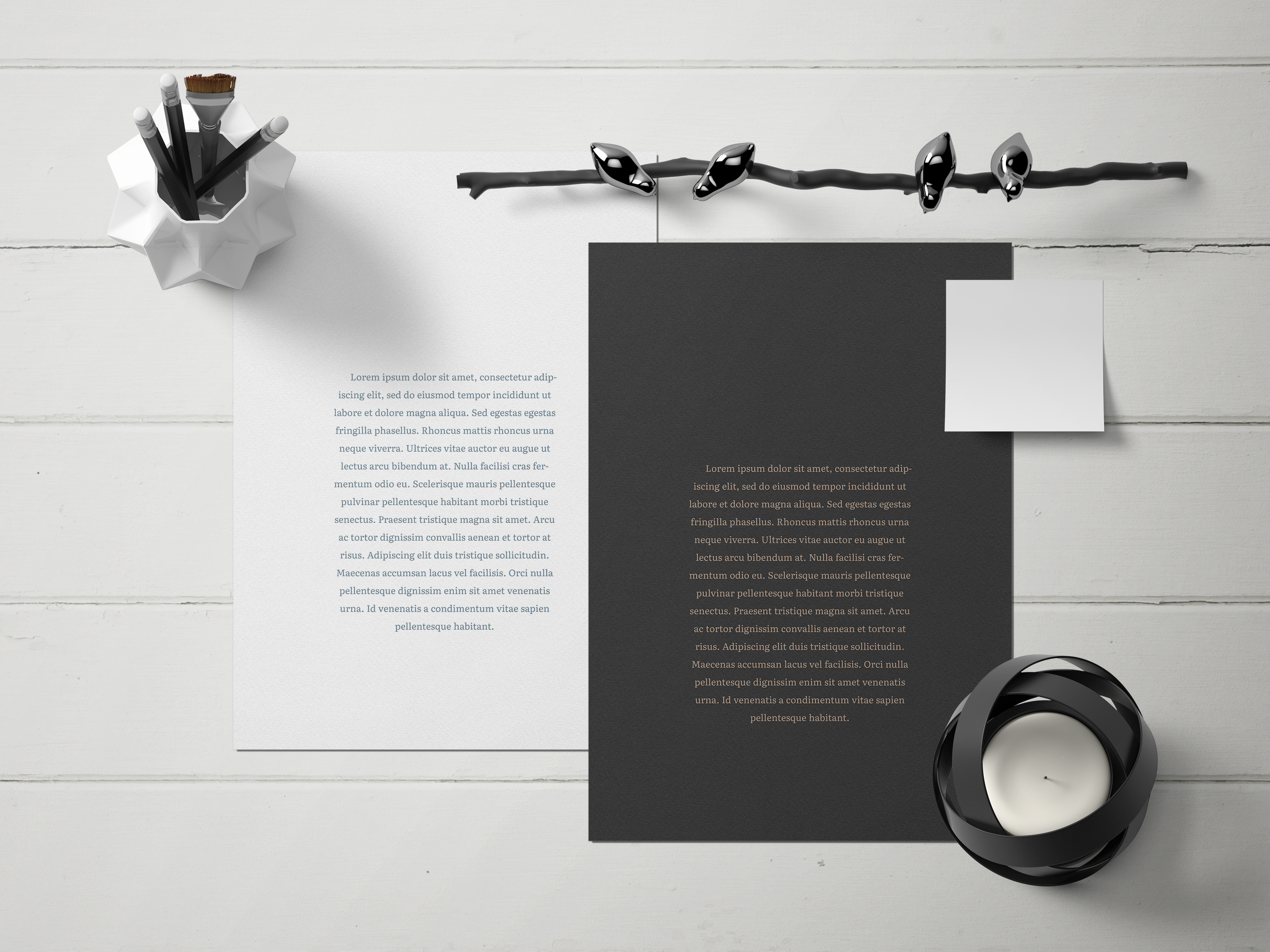 The mockup image features a clean, minimalistic setting with a white wooden background. The main objects include two sheets of paper (one white, one dark grey) centrally aligned and adorned with text. Additional elements include a geometric pen holder with pens and brushes, a modern candle, and a branch with glossy black attachments. This mockup is ideal for showcasing stationery designs or branding concepts. Use our mockup generator to create stunning visuals and share your designs on social media to engage your audience!