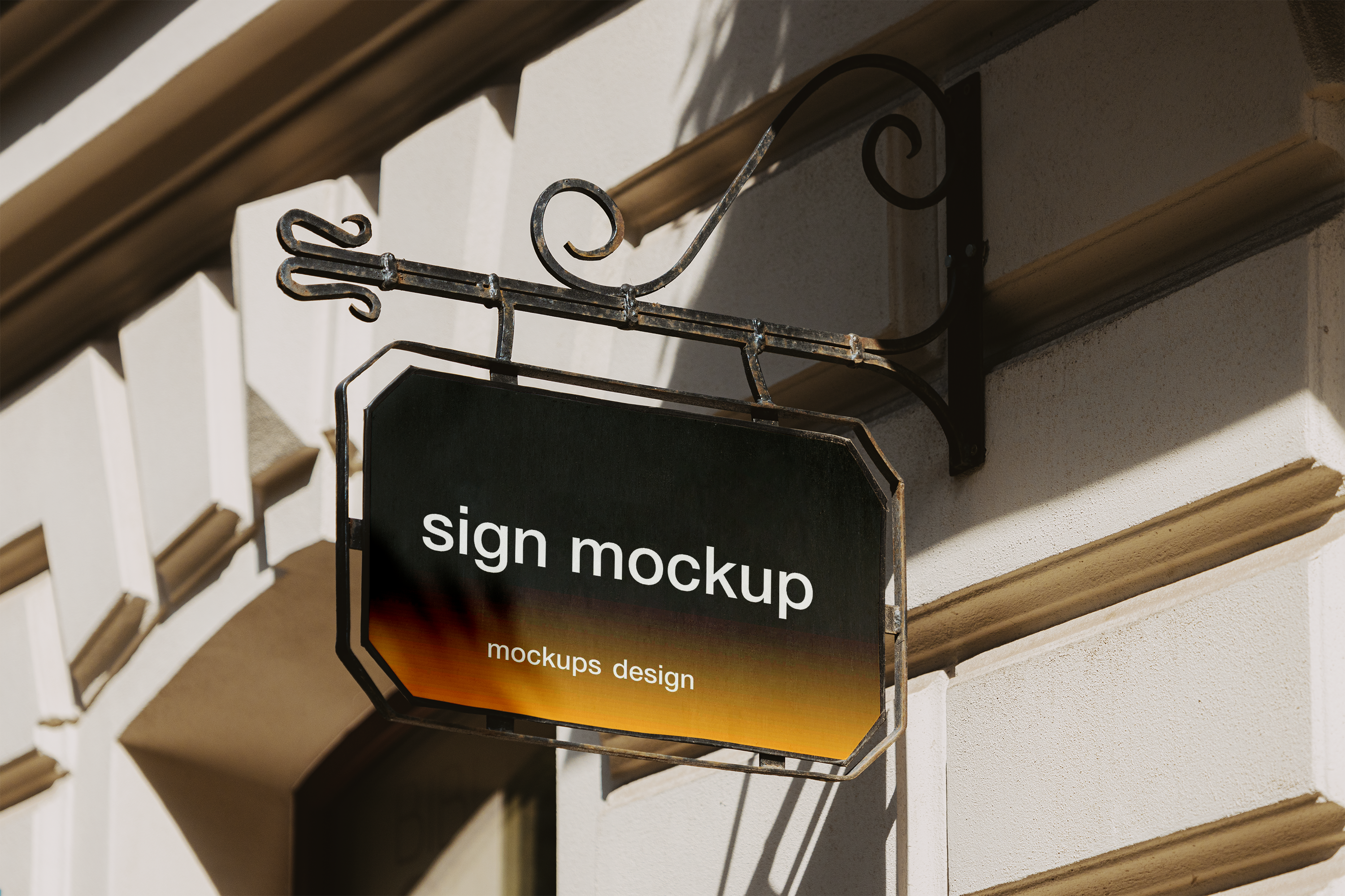 This mockup image features an outdoor signboard mounted on a classic stone building facade. The backdrop is characterized by neatly lined architectural elements and subtle shadows, evoking an urban street setting. The main object, a rectangular sign with elegant metal brackets, displays a modern gradient design transitioning from dark to light hues. This versatile mockup is perfect for showcasing your brand logo or message in a realistic environment. Use our mockup generator to create stunning visuals and share your unique designs on social media today!