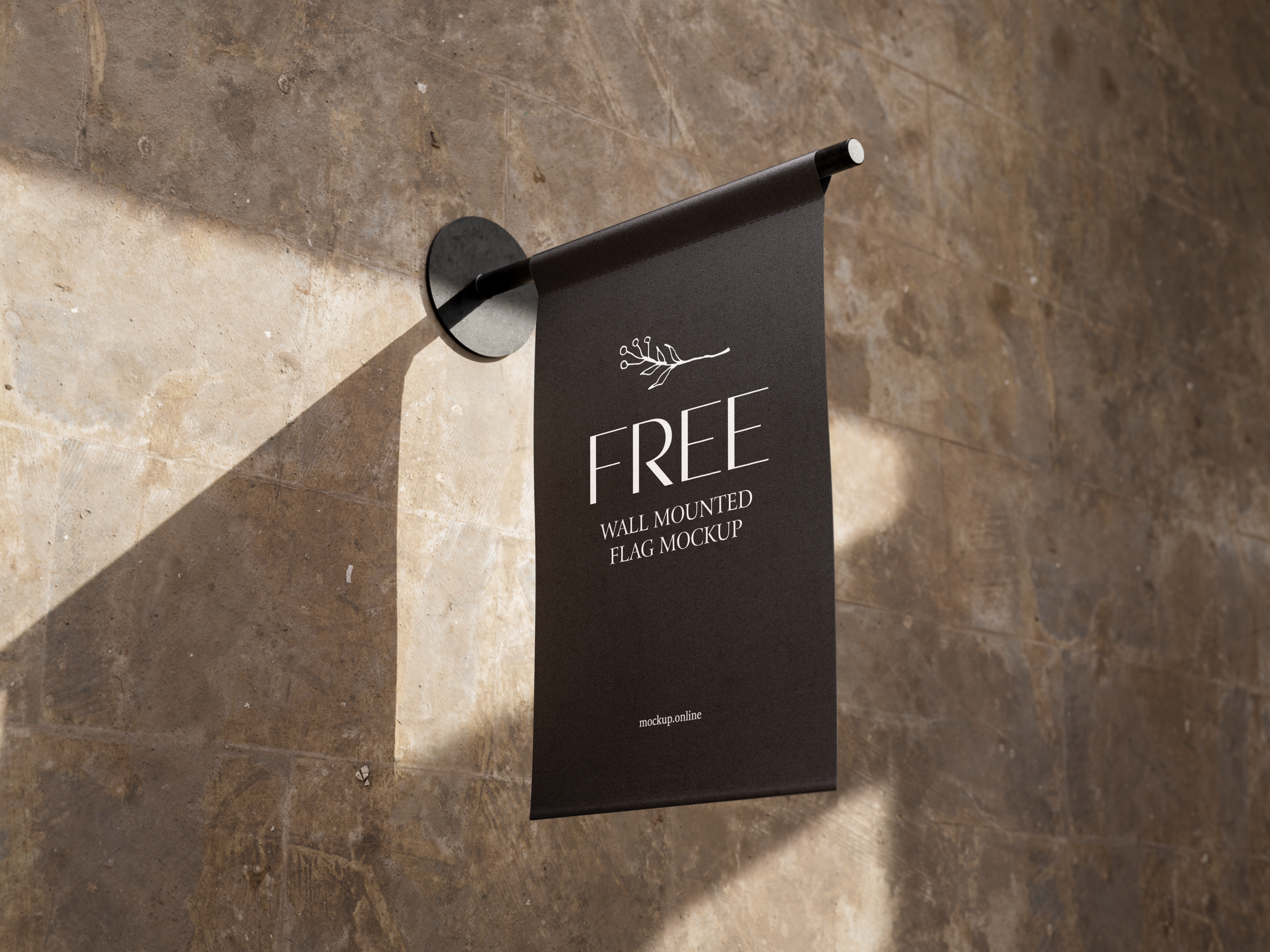 The mockup image features a wall-mounted flag displayed against a textured, stone-like background with subtle sunlight casting shadows. The flag is black with crisp white design elements. This mockup is ideal for showcasing logos or promotional content in a stylish and modern manner. Use this mockup to visualize your advertisements in a real-world setting. Take advantage of our mockup generator to craft your unique designs and share them on social media for maximum impact. Start creating now!