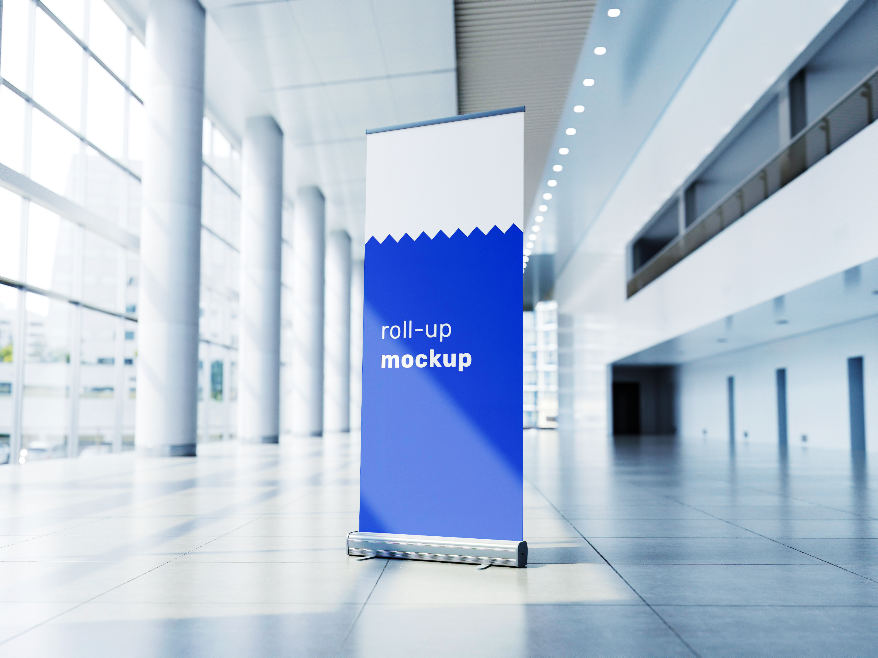 The mockup image features a sleek roll-up banner situated in a spacious, modern lobby with tall windows and abundant natural light. The banner has a minimalist design with a sharp, blue and white color scheme, and clean lines. This mockup is ideal for showcasing your brand or marketing materials in a professional setting. Use this mockup generator to visualize your design and boost your advertising efforts. Create your unique roll-up banner and share your design on social media today!