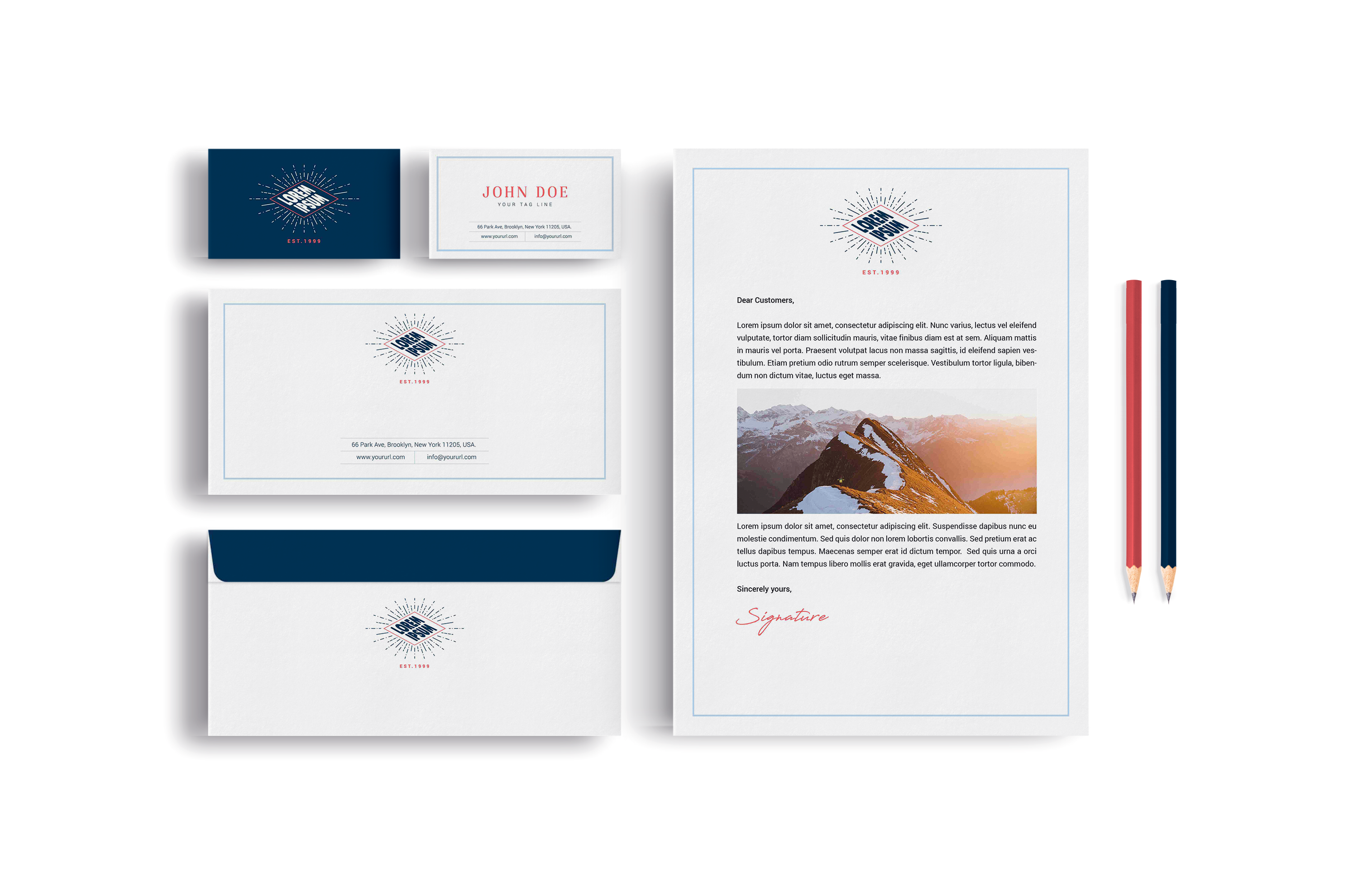 The mockup image showcases a clean, professional stationery set against a simple white background. It includes a letterhead, business cards, envelopes, and two pencils. Each item features a cohesive design with a prominent logo and neat typography in blue and red accents. This setup is ideal for corporate branding and professional correspondence. Use this mockup to visualize and refine your branding materials. Try our mockup generator today and share your stunning designs on social media to impress your audience!