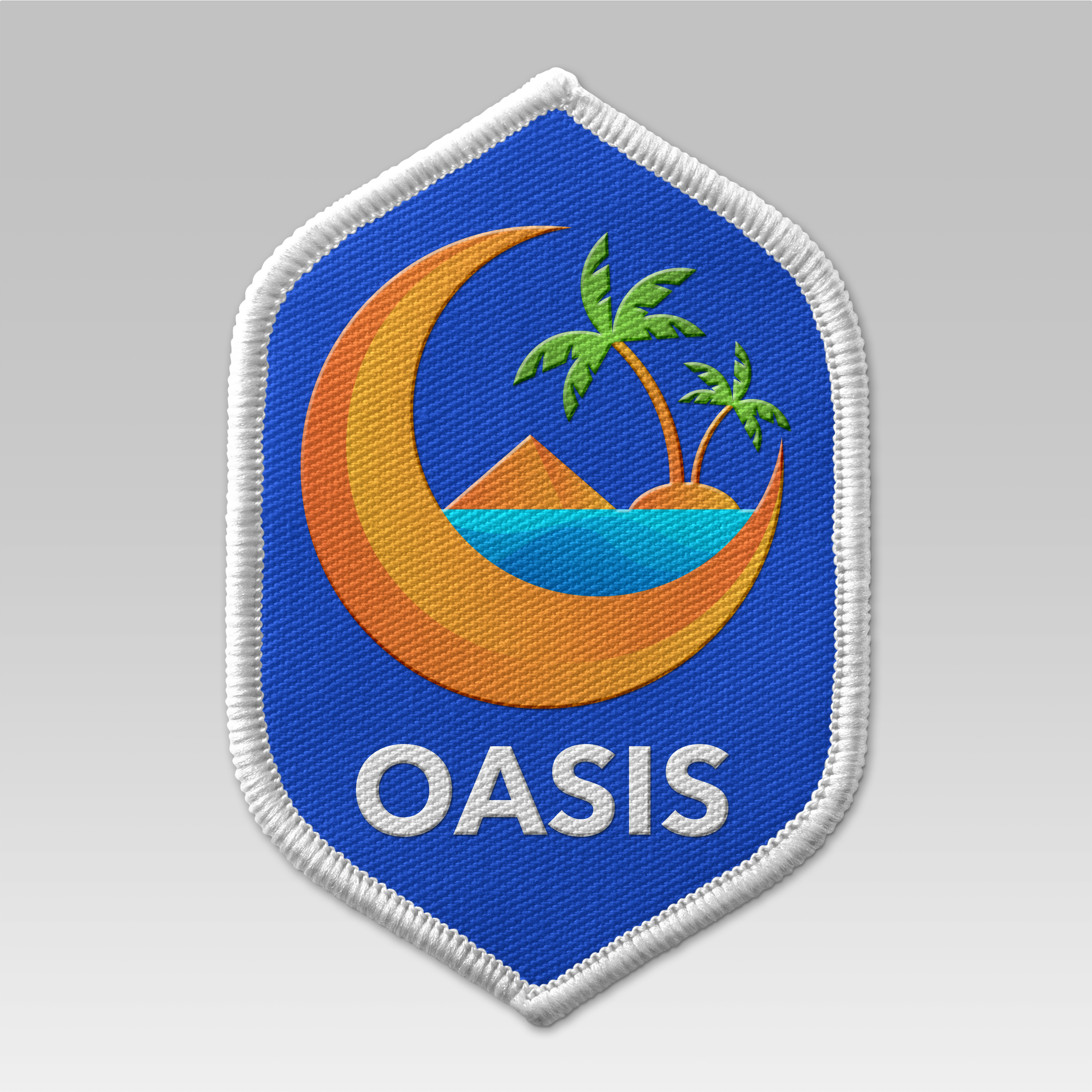 A blue patch with the word oasis on it, suitable for use as a template or mockup.