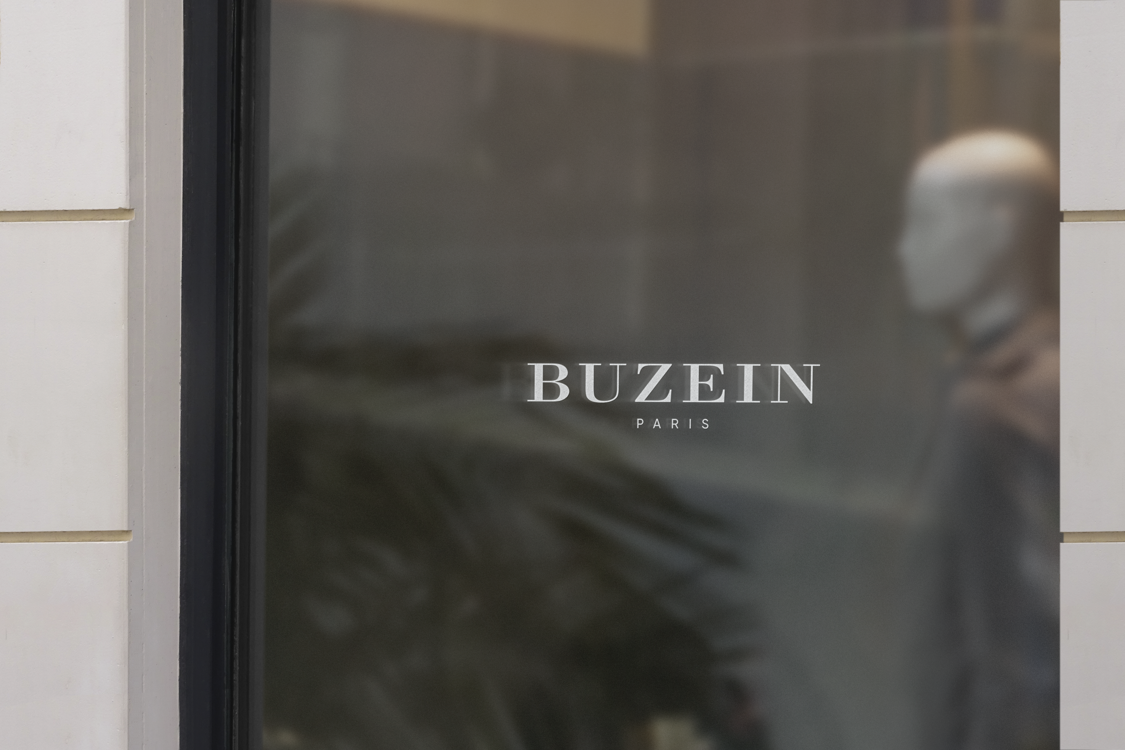 A blurred window display with a mannequin and the text "buzein" visible, serving as a template.