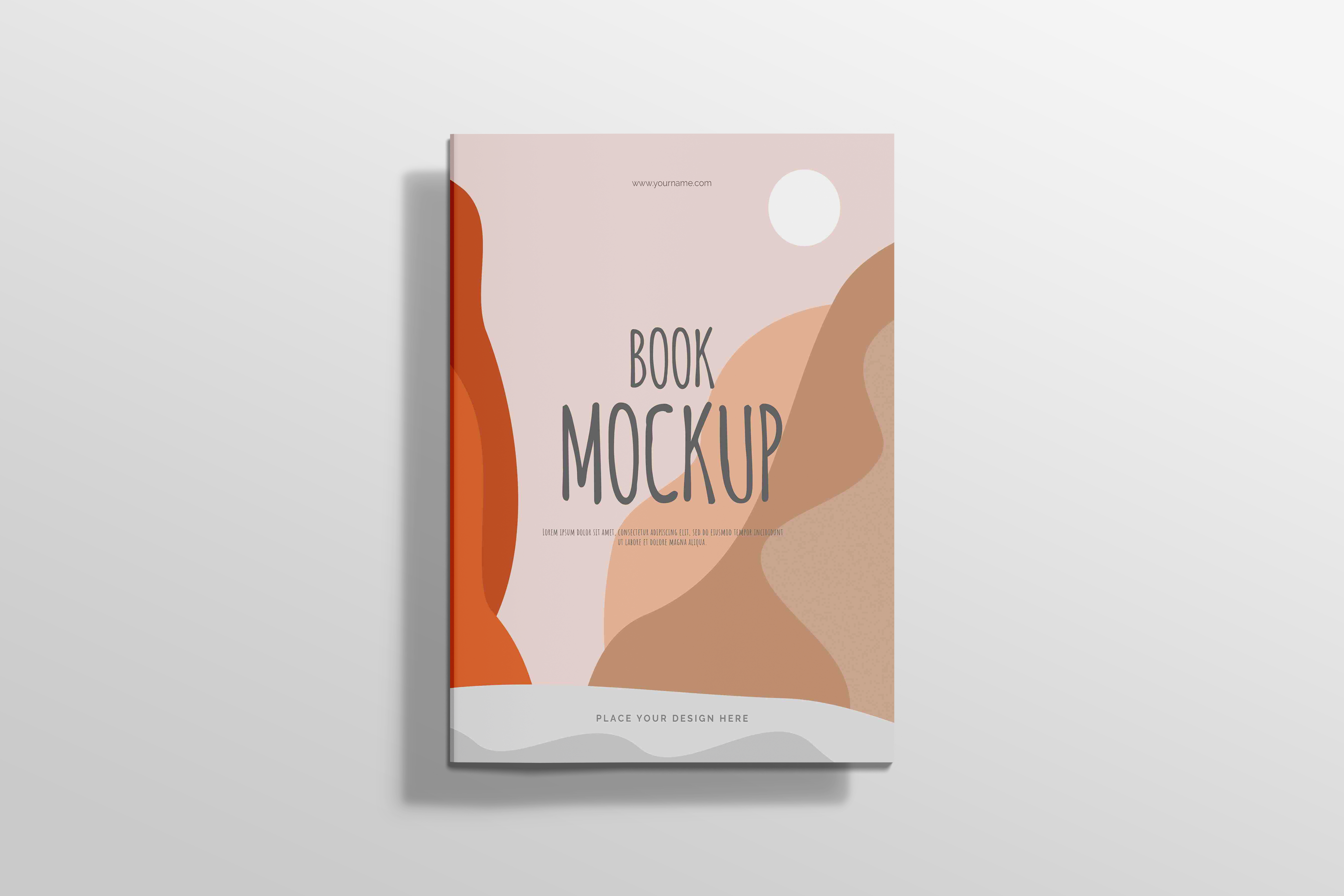 The mockup image showcases a book cover set against a minimalistic white background. The main object, a vertically-oriented book, features a modern, abstract design with flowing shapes in warm hues of orange, beige, and brown on a light background. Ideal for advertising book covers or promoting literary content, this mockup gives a professional look to your designs. Use the mockup generator to craft your unique cover and share your design on social media today!