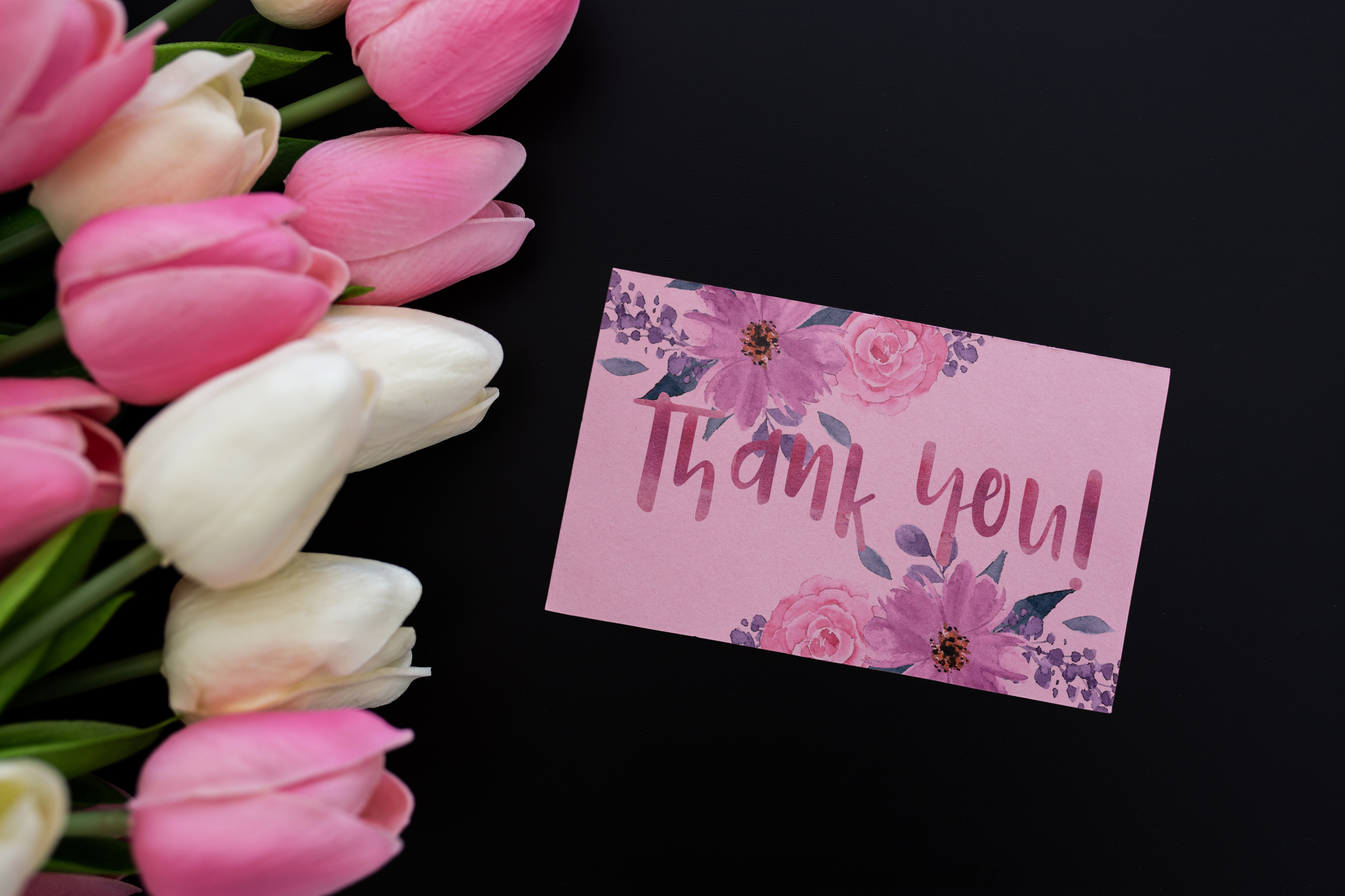A bouquet of pink and white tulips next to a 'thank you' card on a black background serves as an elegant mockup.