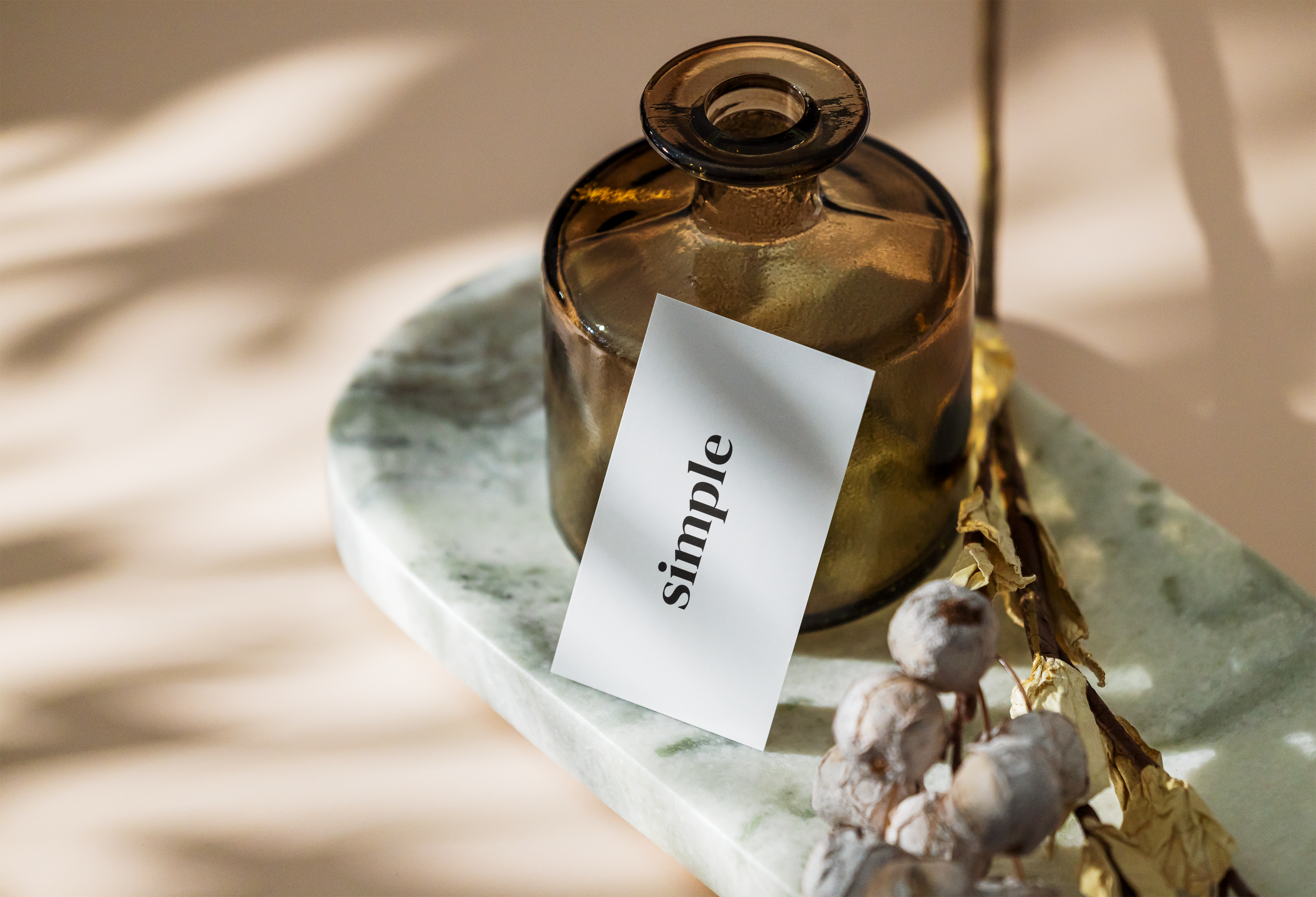 The mockup image features a minimalist setting with soft shadows in the background. The main object is a small, brown glass bottle placed on a green marbled surface. A business card with a plain design, featuring the word "simple," leans against the bottle. Dried flowers are also present, adding an organic touch. This mockup can be used for advertising by showcasing branding, logos, or messages in an elegant and stylish manner. Use the mockup generator today and share your unique design on social media!