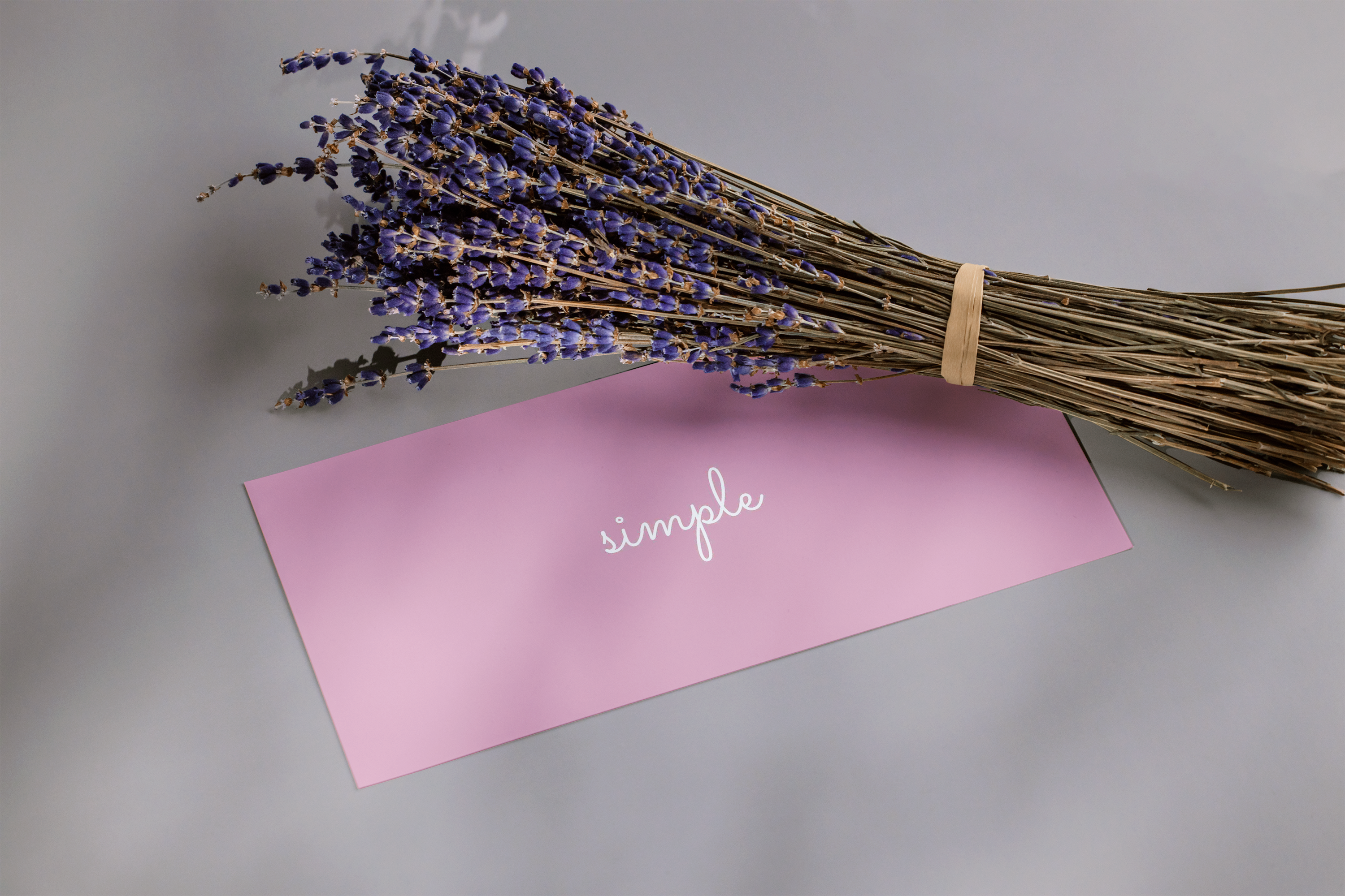 The mockup image features a sleek minimalist setting with a light grey background. The main element is a pink rectangular card adorned with simple white cursive text. A dried lavender bouquet rests gracefully on the right side of the card, adding a natural, delicate touch to the scene. This mockup is an excellent tool for showcasing your design in a clean, inviting context perfect for promoting floral shops, wedding invitations, or greeting cards. Try the mockup generator today and share your stunning design on social media!