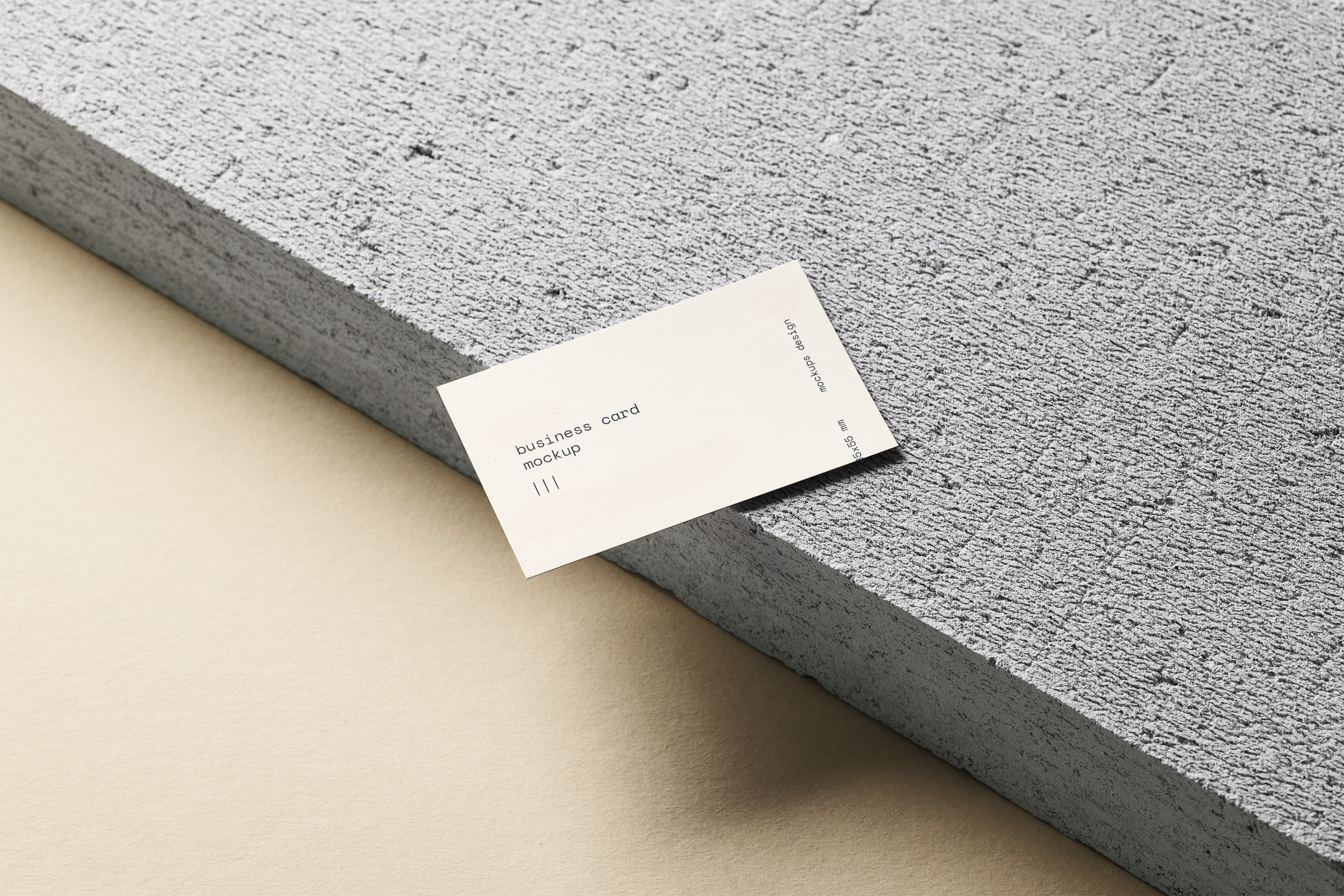 A business card mockup with a minimalistic design rests on the edge of a gray stone slab against a beige background.