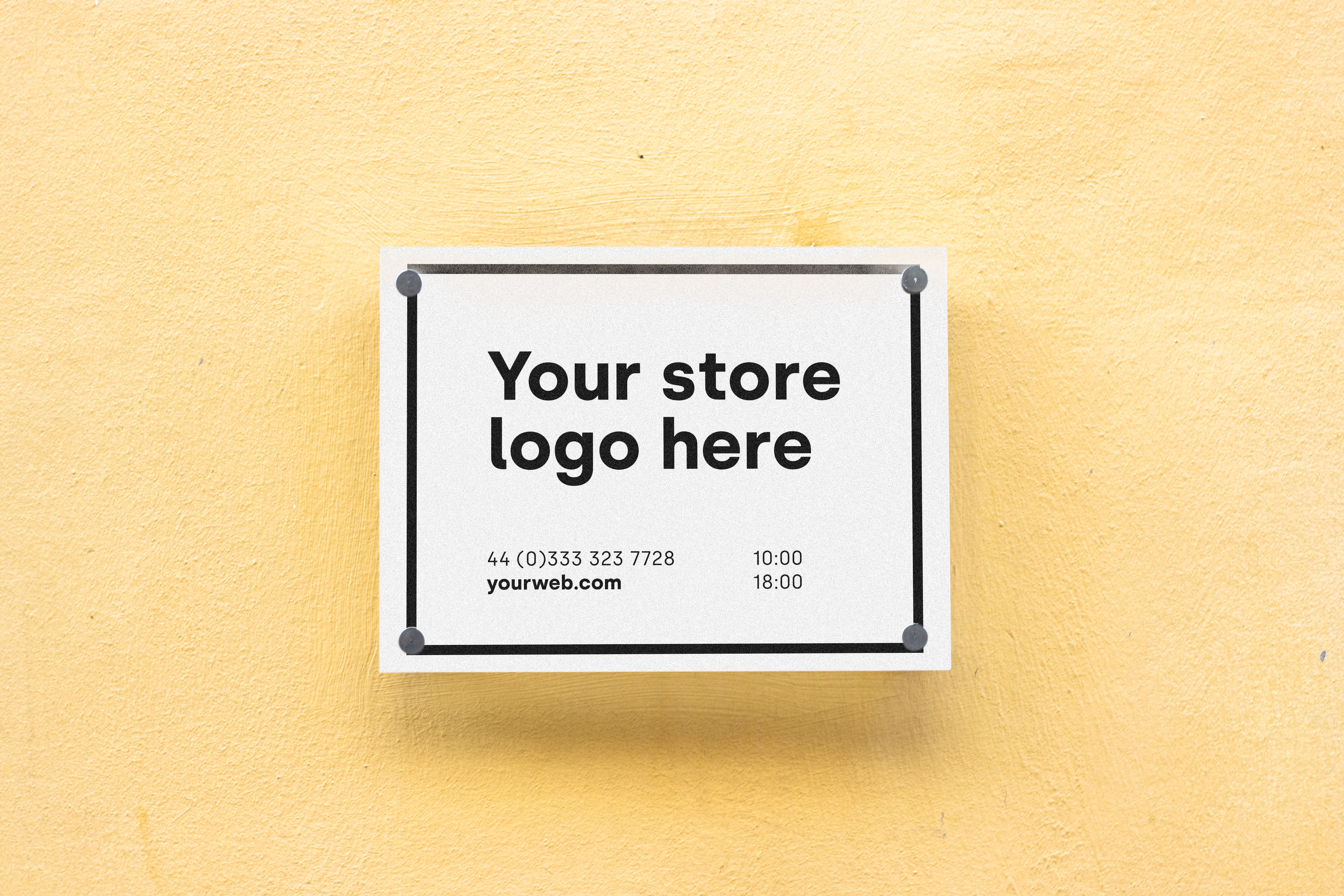 This mockup features a white rectangular sign attached to a textured, light yellow wall, suitable for outdoor display. The sign itself is bordered by a simple black line, accented at the corners, leaving space for prominent typography and essential information. Ideal for storefronts or business promotions, this mockup can effectively showcase your brand’s identity. Use this mockup generator to create your design, then share it on social media to attract customers and enhance your brand visibility!