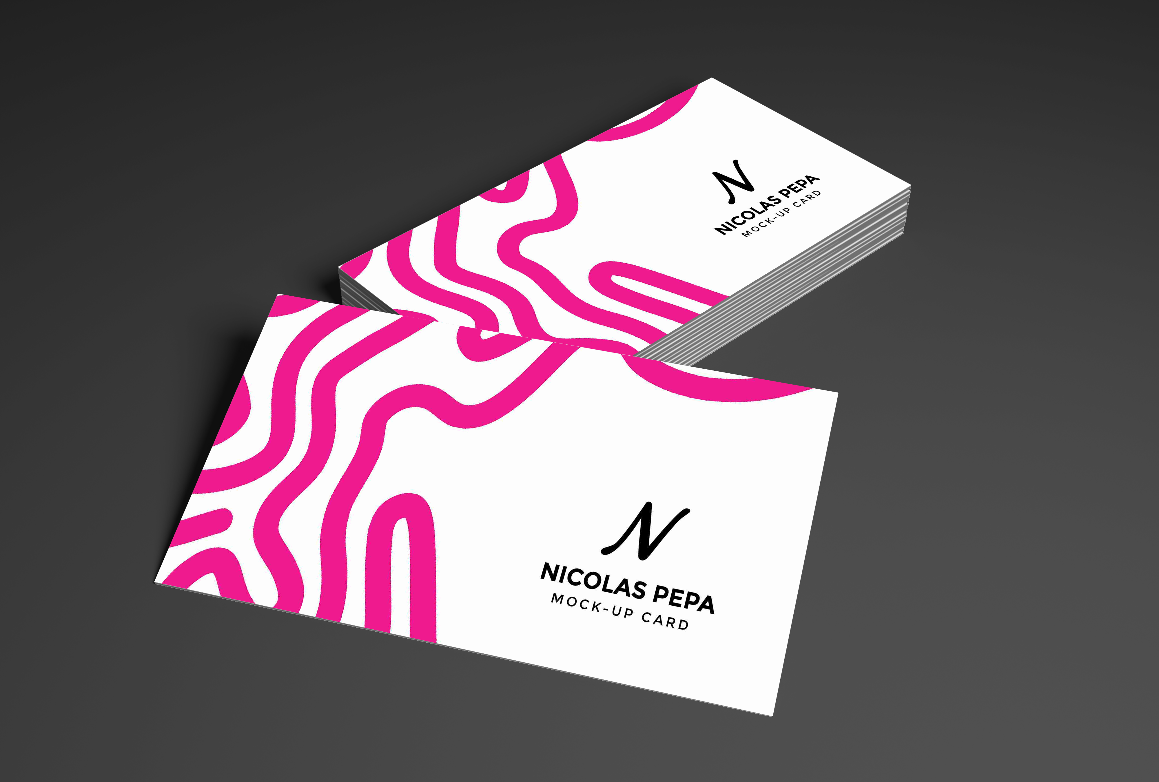 The mockup image displays a stack of business cards set against a dark gradient background. The main object, the business cards, features a white surface with abstract pink wavy lines design on one end. The layout is modern and eye-catching, perfect for professional branding. This mockup can be used for advertising new business cards, showcasing the unique design meant to impress potential clients. Use our mockup generator today and share your personalized business card designs on social media to gain more visibility!