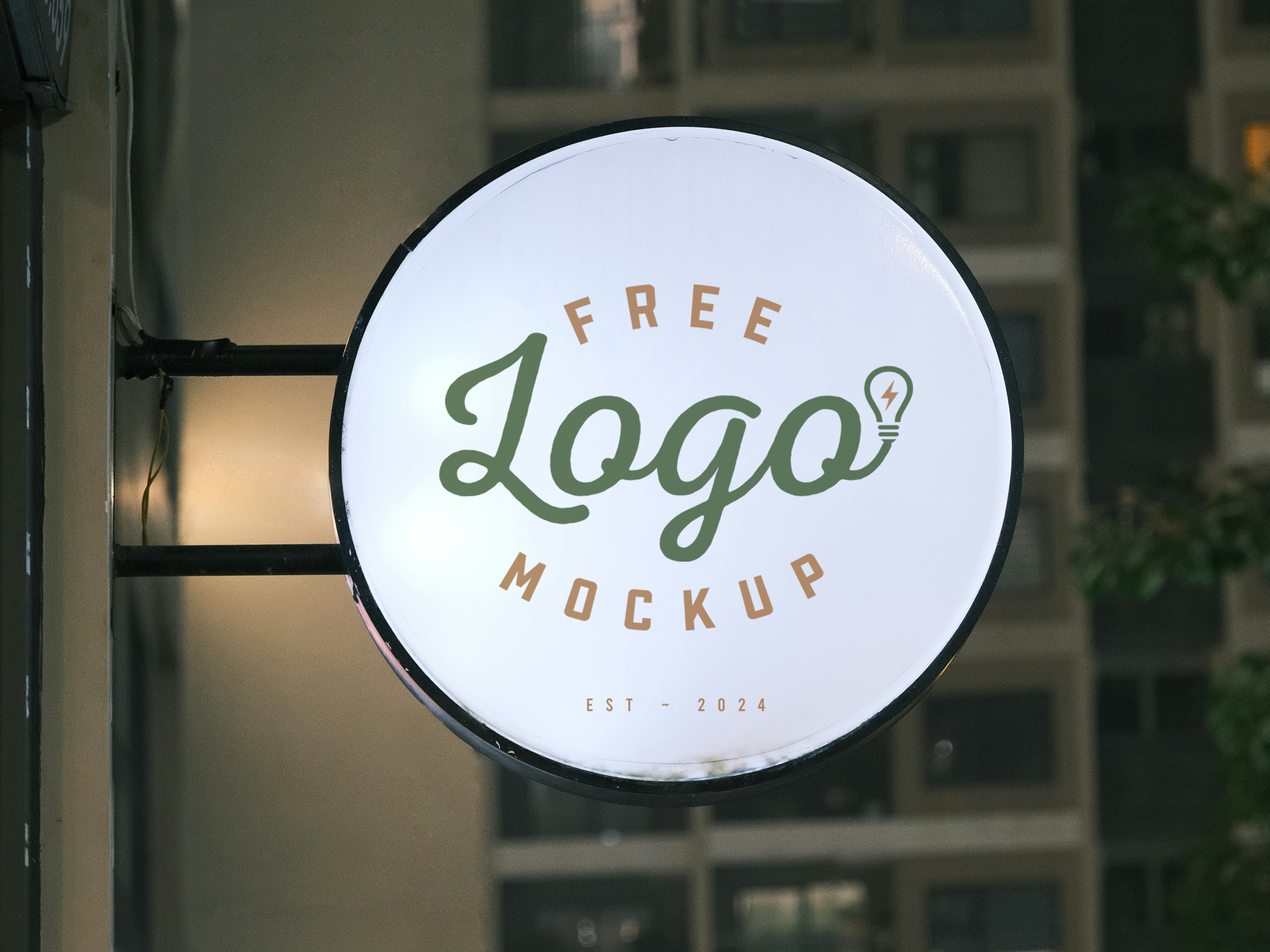 The mockup image features a circular, well-lit sign attached to a building, set against a blurred urban night background with dimly lit windows and some greenery. The main object, the sign, is white with green and brown design elements, giving it a modern and appealing look. Perfect for advertising your business, this mockup will help you visualize your storefront logo effectively. Use our mockup generator now and share your stunning design on social media to attract more customers!