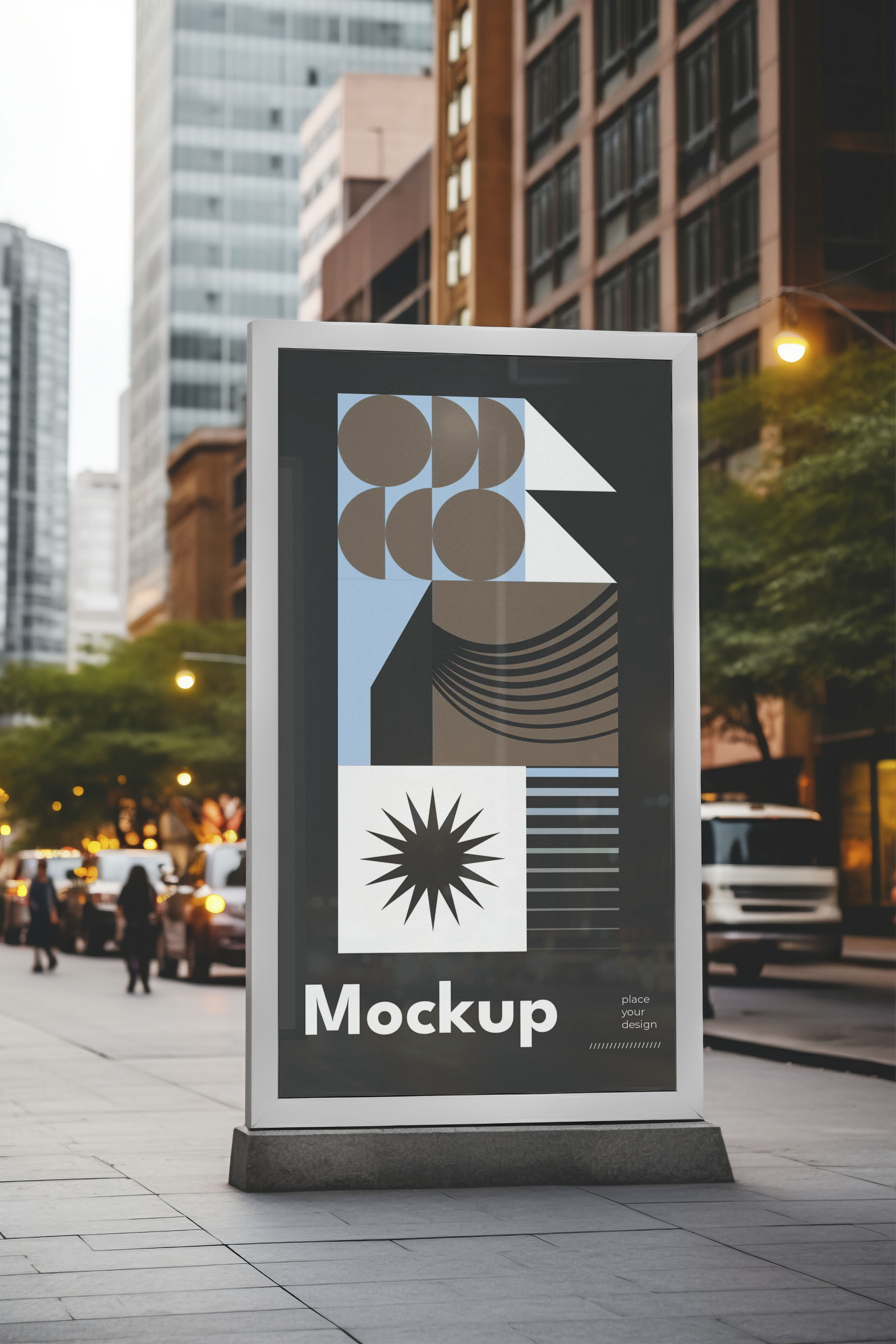 This mockup features a city street setting with tall buildings and a bustling evening atmosphere in the background. The main object is a large, illuminated billboard showcasing a modern and abstract design with geometric shapes in neutral tones. The billboard is eye-catching and strategically placed for maximum visibility. Utilize this mockup for advertising to captivate the urban audience. Use the mockup generator to visualize your brand message, and share your creative designs on social media to enhance your marketing campaign.