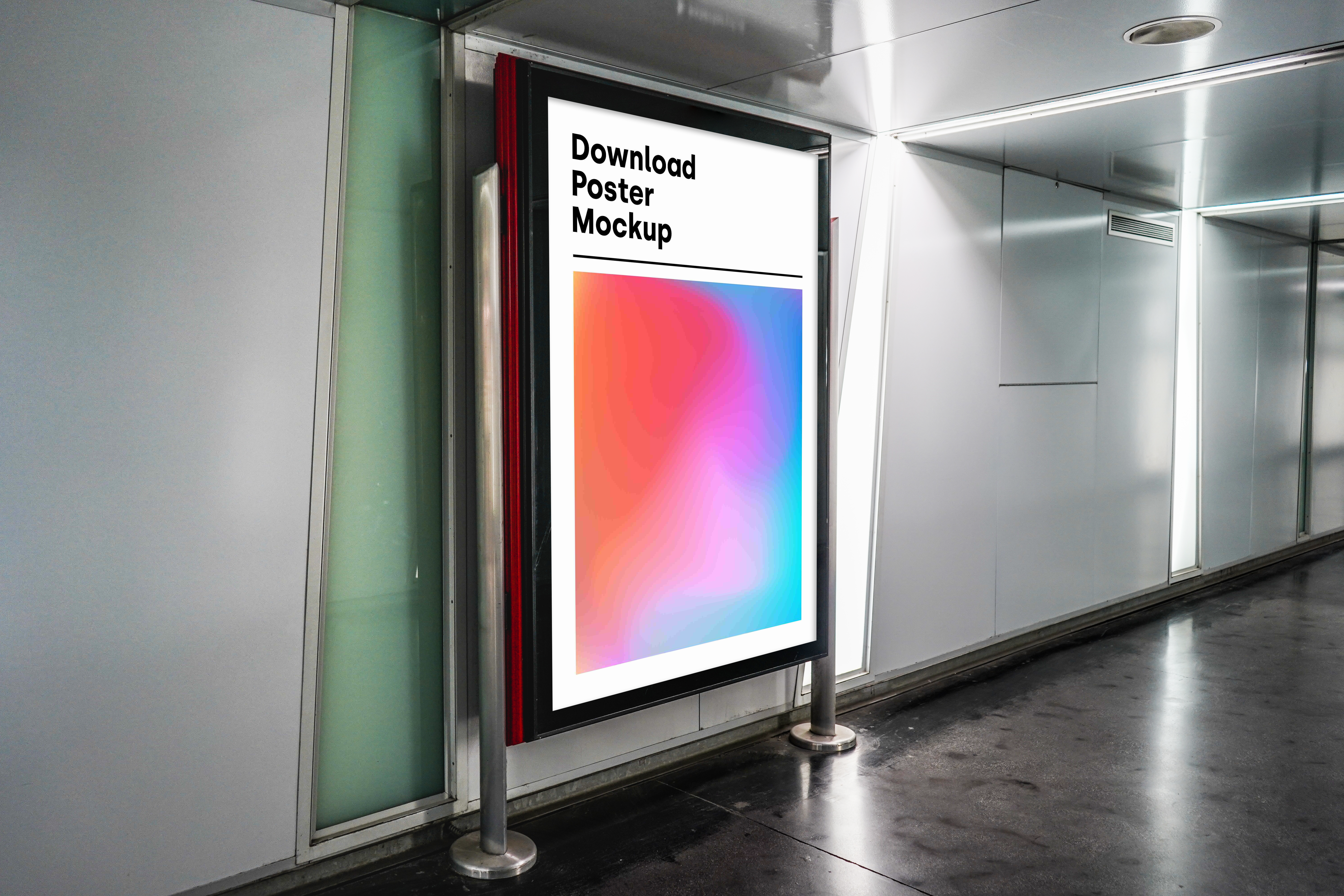 The mockup image features a sleek, modern hallway with glossy walls and a reflective floor. The main object is an illuminated billboard showcasing a vibrant, gradient design with red, blue, and purple colors. This mockup is perfect for advertising campaigns, allowing you to visualize your poster in a dynamic public space. Use this mockup generator to create eye-catching designs and share them on social media to captivate your audience today!