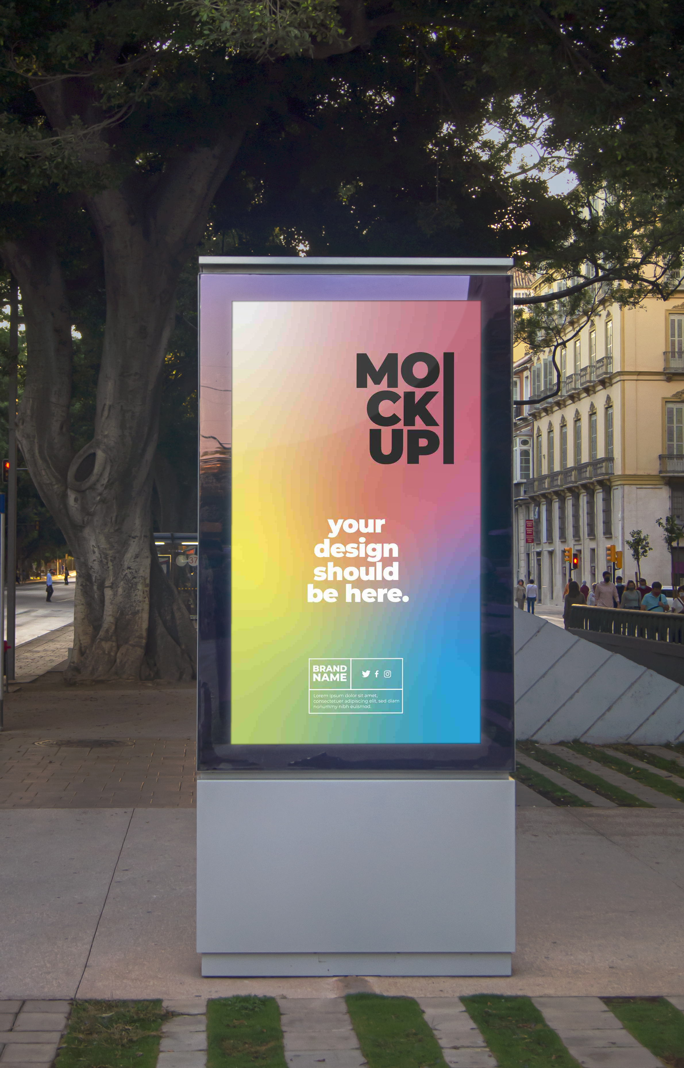 This mockup image features a street advertising board placed in a bustling city environment with a tree and buildings in the background. The main object is a vertical display with a bright, gradient background from yellow to blue, designed to catch attention. It has bold black text and minimalistic icons, offering a modern appeal. Utilize this mockup to visualize your advertisement in a real-world setting. Use our mockup generator to create your design and share it on social media to capture your audience’s attention!