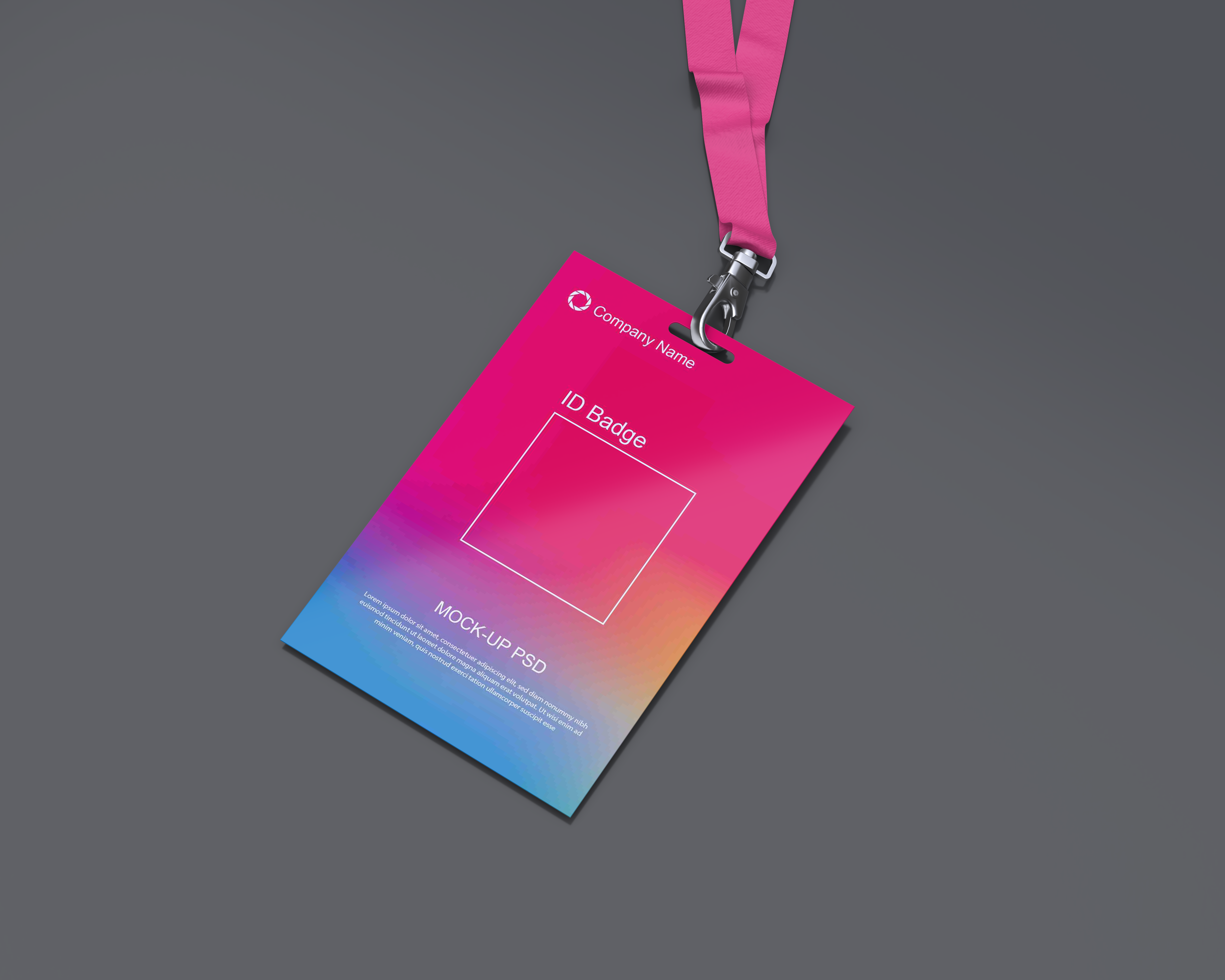 A colorful conference badge mockup with a pink lanyard on a grey surface.