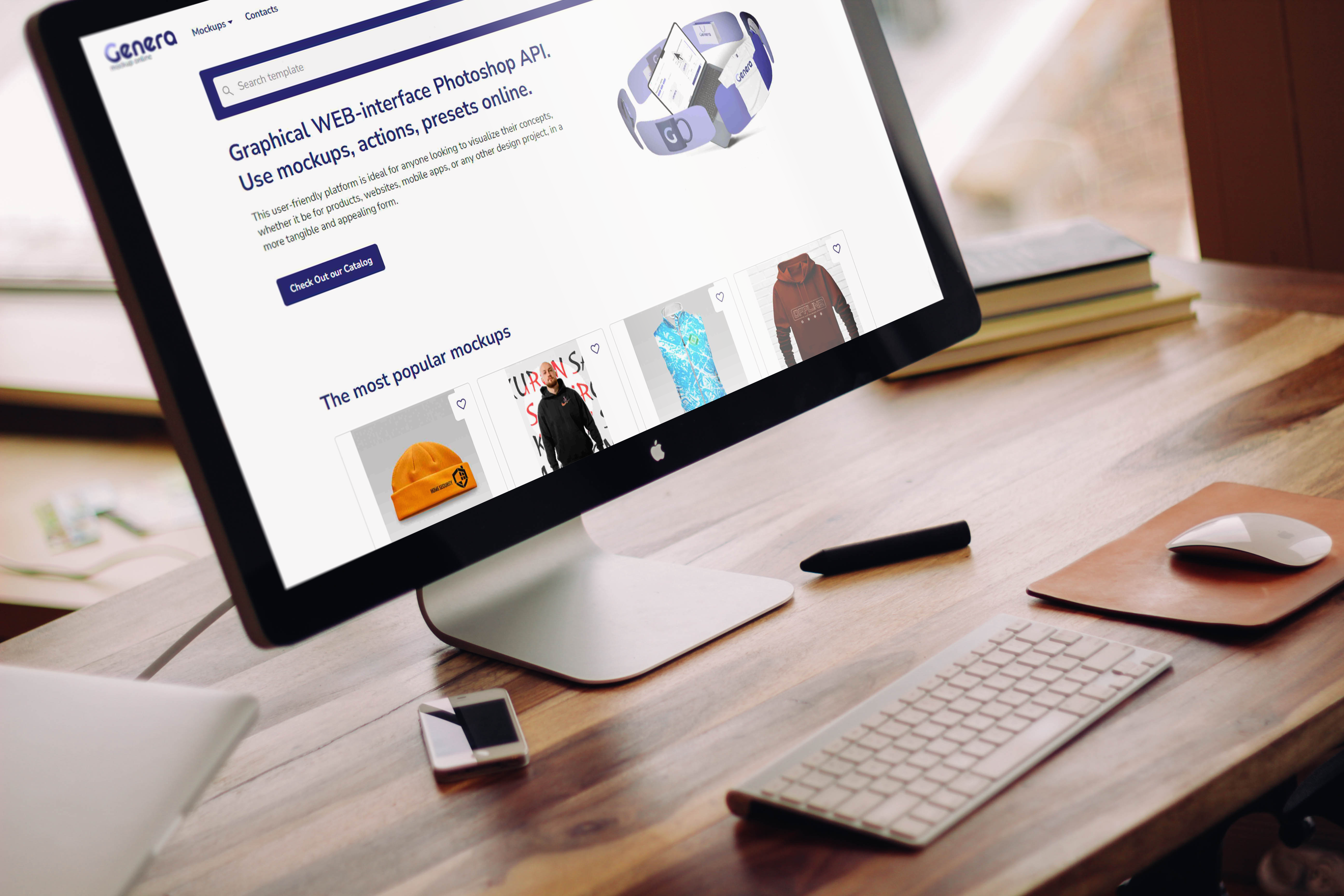 The mockup image features a sleek desktop computer in a cozy, naturally lit home office setting with a blurred bookshelf background. The monitor displays a webpage showcasing various product mockups, including hats, t-shirts, and hoodies. The design layout is clean, with a user-friendly interface. This mockup is perfect for advertising your digital designs in a professional environment. Use our mockup generator to create stunning visuals and share your unique designs on social media today!