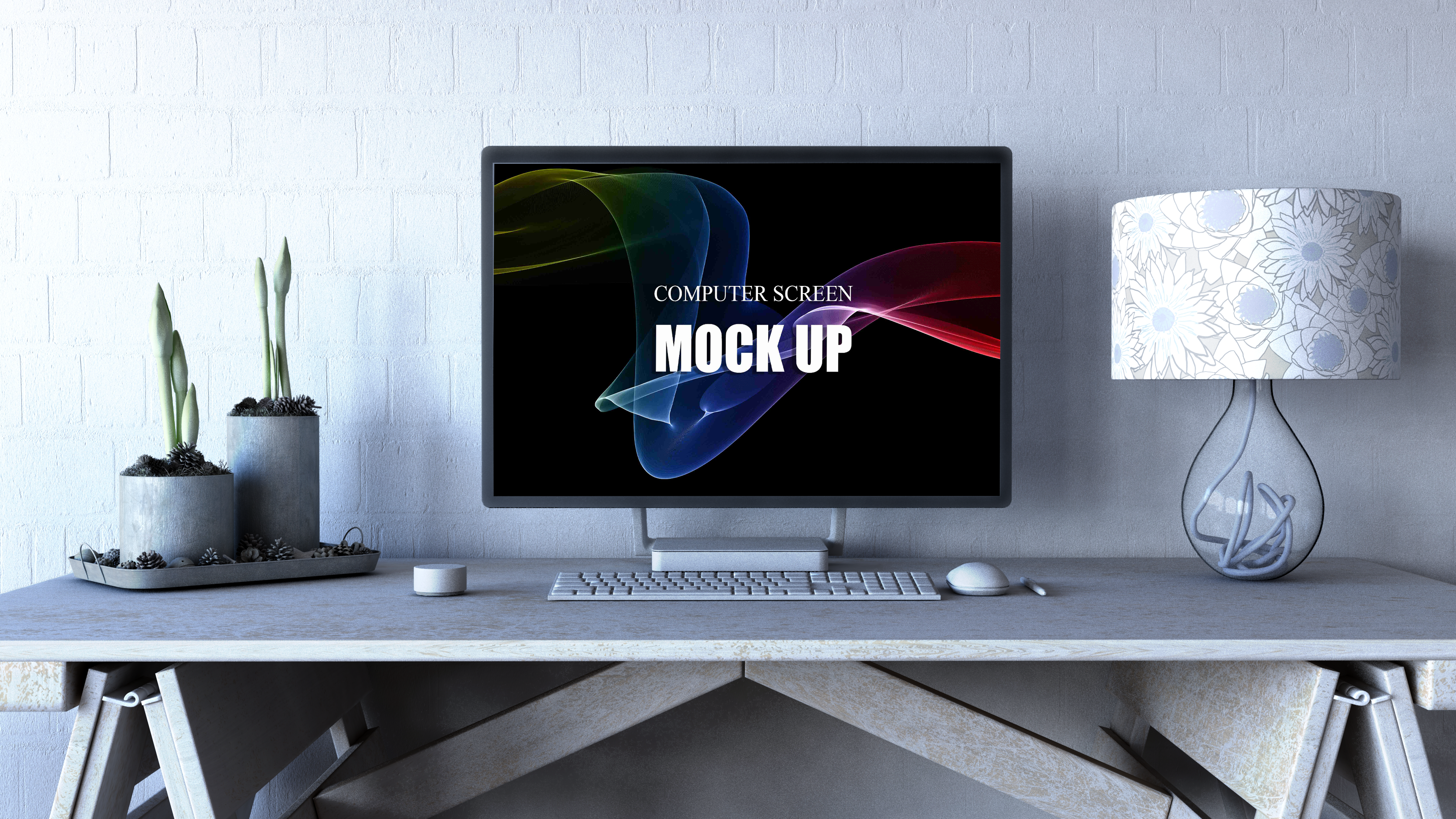 The mockup image displays a computer screen set in a clean, modern workspace with a minimalist design. The background features a textured white brick wall, which provides a neutral and sophisticated backdrop. The desk itself is a light-colored wood with a sleek finish, adding to the contemporary aesthetic.