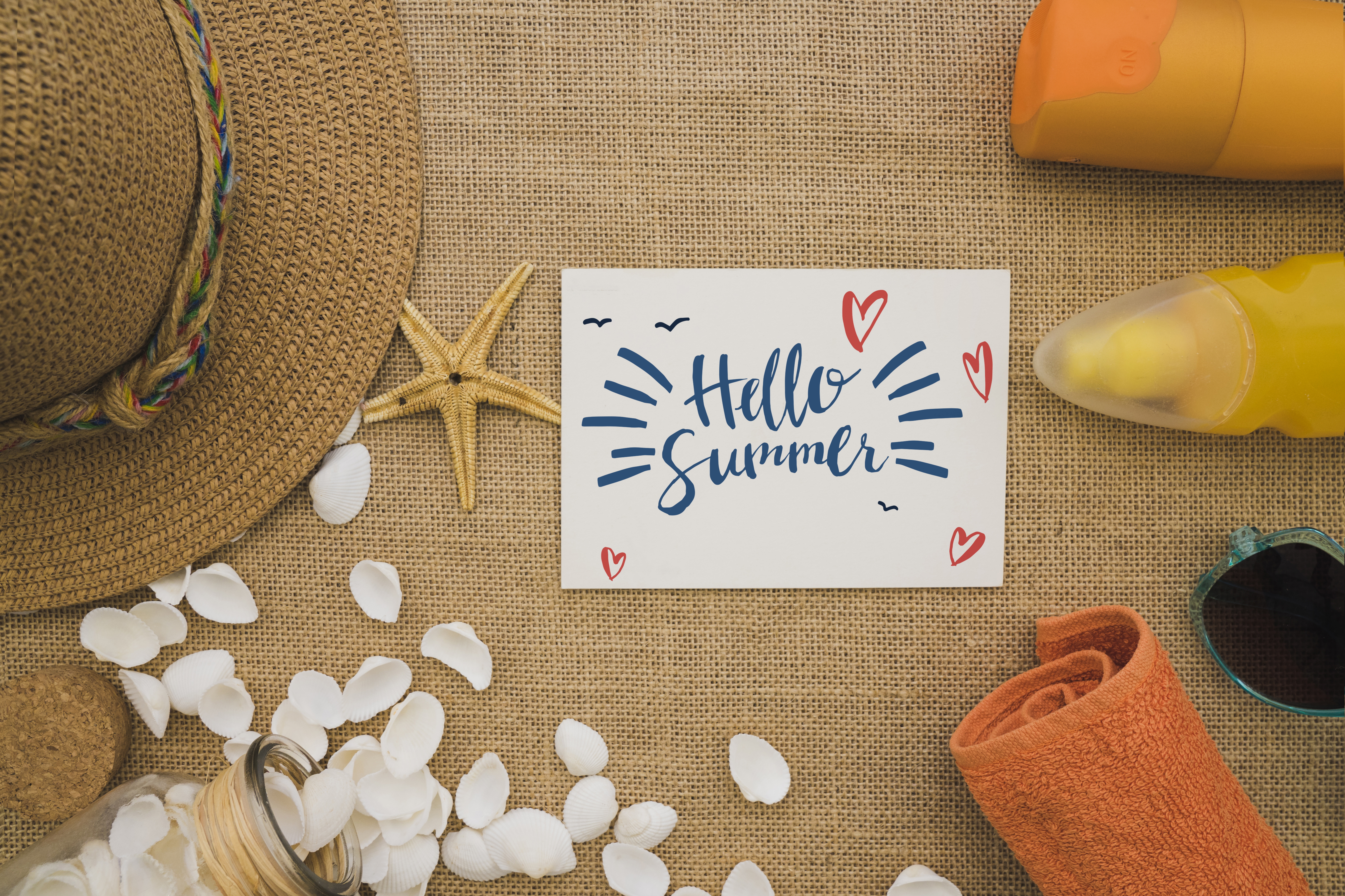 The mockup image features a summer setting with a burlap background. Central to the image is a postcard adorned with heart and sunburst illustrations. Surrounding items include a straw hat, starfish, orange towel, sunglasses, sunscreen, white flower petals, and a jar. This mockup is perfect for seasonal advertising, such as promotions for summer products, travel packages, or beach events. Use our mockup generator to create stunning summer-themed designs and share them on social media to capture your audience's attention!