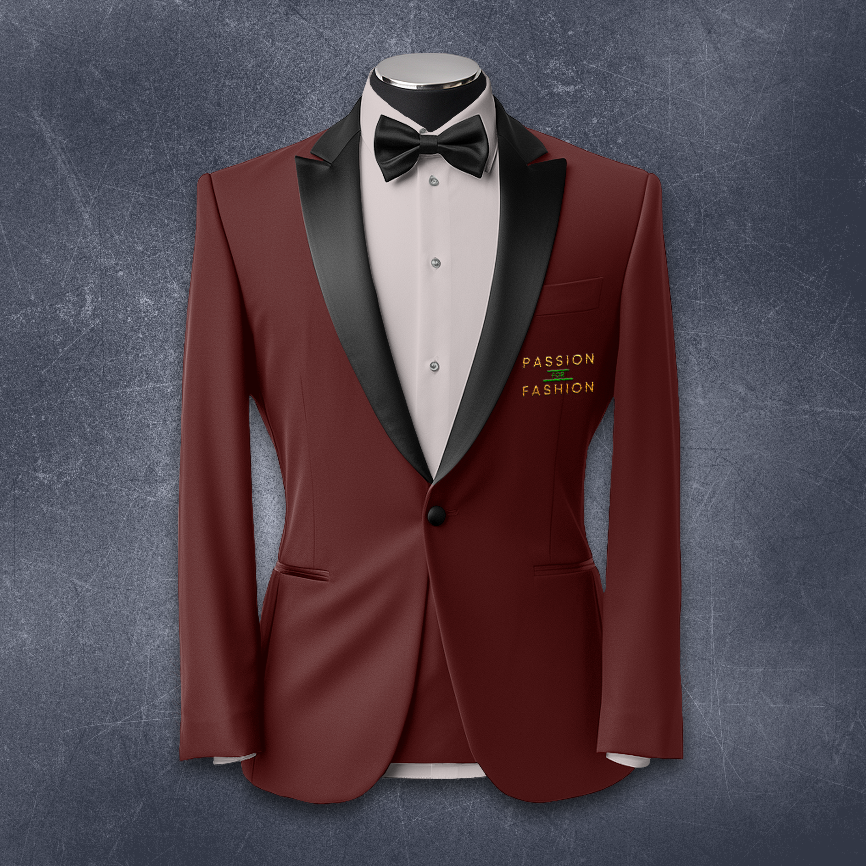 A formal maroon tuxedo with a black lapel and bow tie displayed against a textured gray background template.
