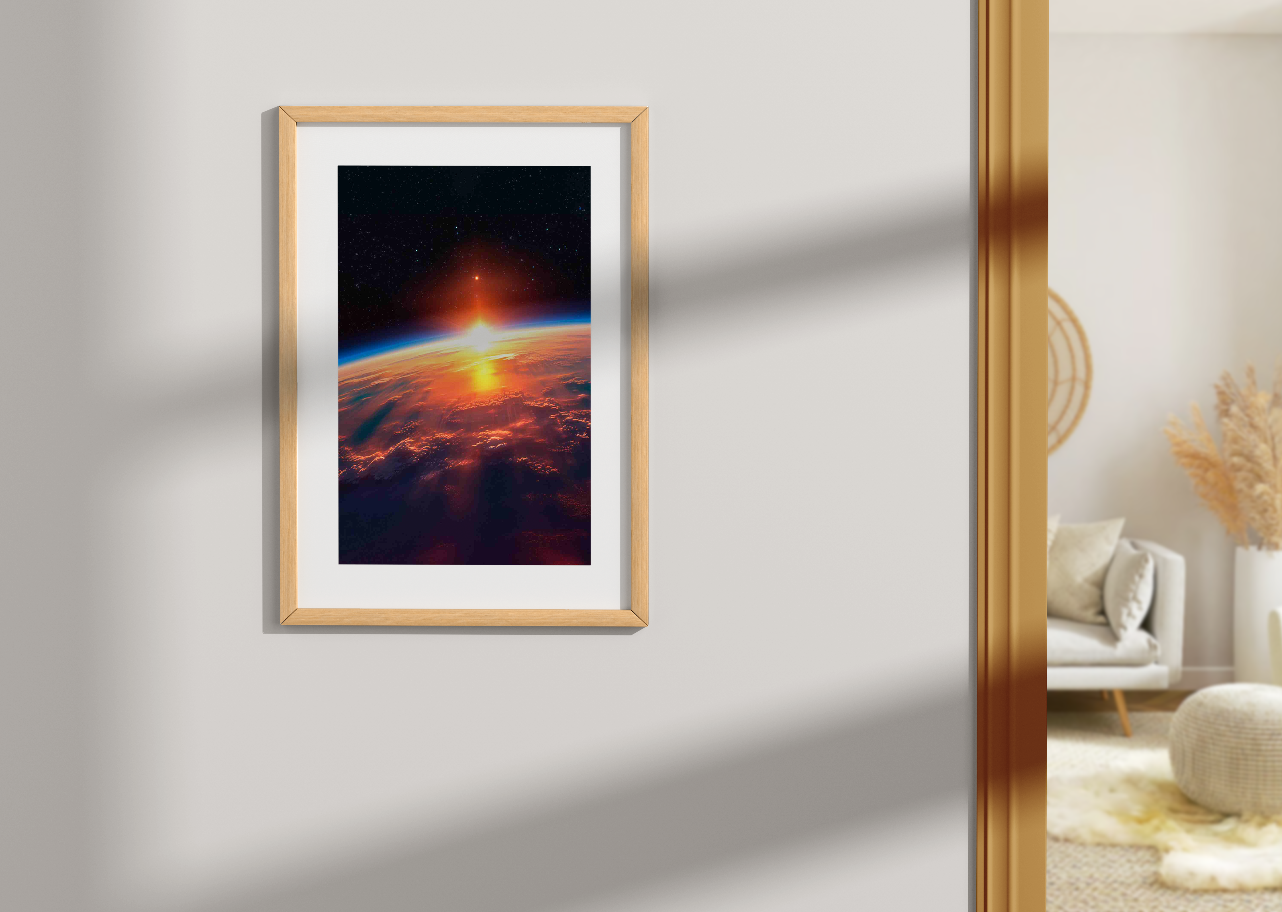 The image features a digital mockup of a framed picture hanging on a light gray wall. The setting includes a partially visible modern living room with cozy decor elements like a beige armchair, a pouf, and dried pampas grass in the background. The main object is a wooden-framed artwork depicting a vibrant sunrise above the Earth's horizon. This mockup can be used to advertise wall art or framing services. Use our mockup generator to create your own design and share it on social media!