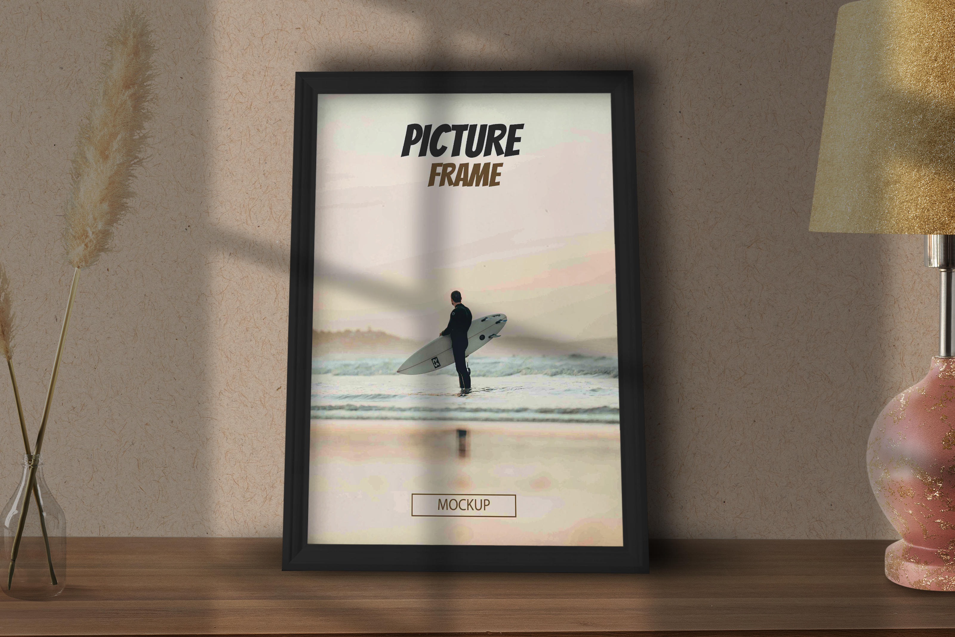 In a cozy indoor setting, a picture frame mockup rests on a wooden surface. The background features a beige textured wall. The main object is a sleek black picture frame displaying an image of a person with a surfboard by the beach. Design elements include natural light shadows, a glass vase with dried pampas grass, and a pinkish-marble lamp with a tan shade. Use this elegant mockup to showcase your artwork for advertising. Try the mockup generator now and share your creations on social media!