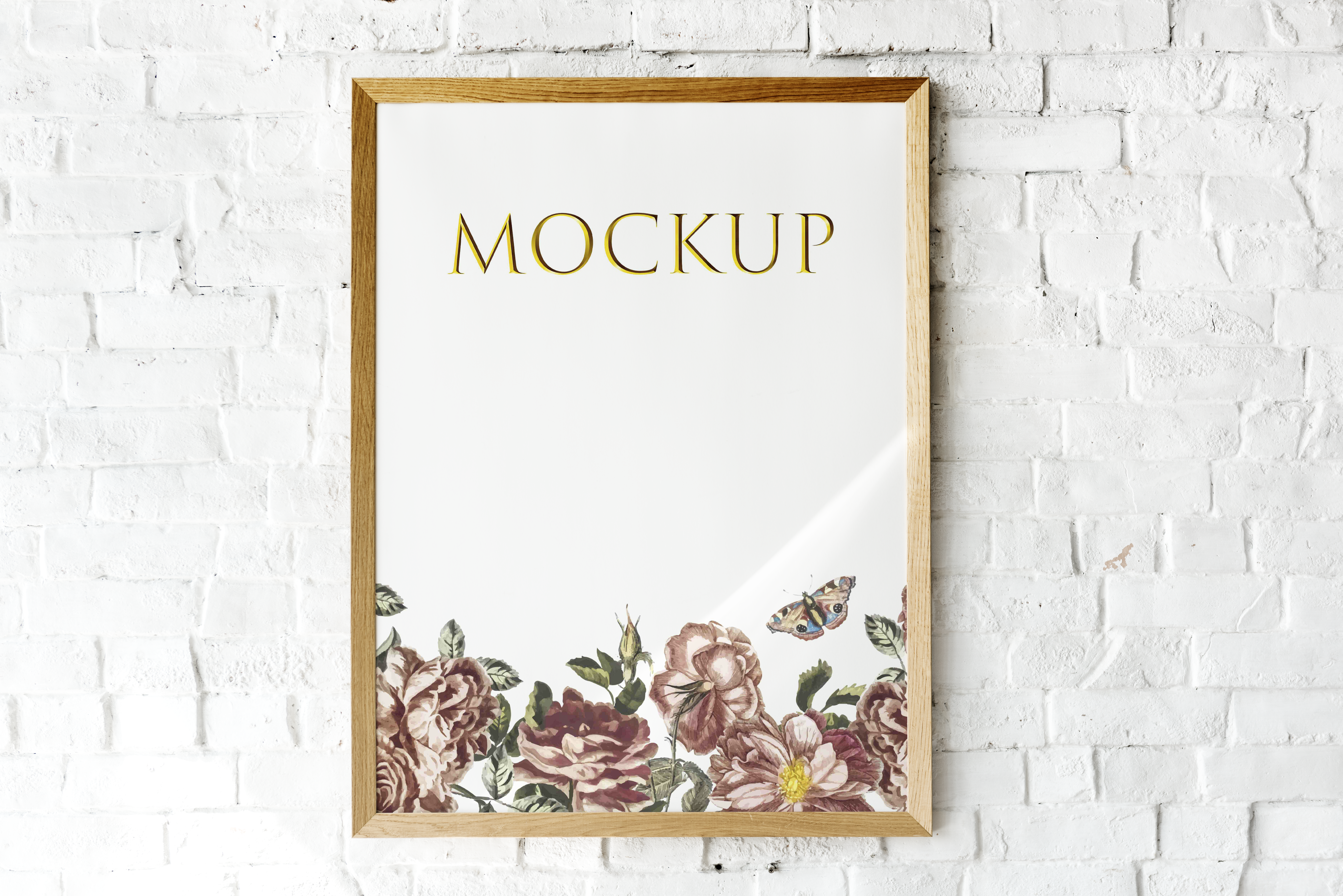 The mockup image features a wooden-framed poster hanging on a white brick wall. The poster displays a minimalist design with large text at the top and delicate floral patterns at the bottom, including roses and a butterfly in soft, natural colors. This visually appealing design is perfect for showcasing artwork or promotional materials in a stylish home or office setting. Use this mockup generator to create your custom design and share it on social media to attract attention and engagement.