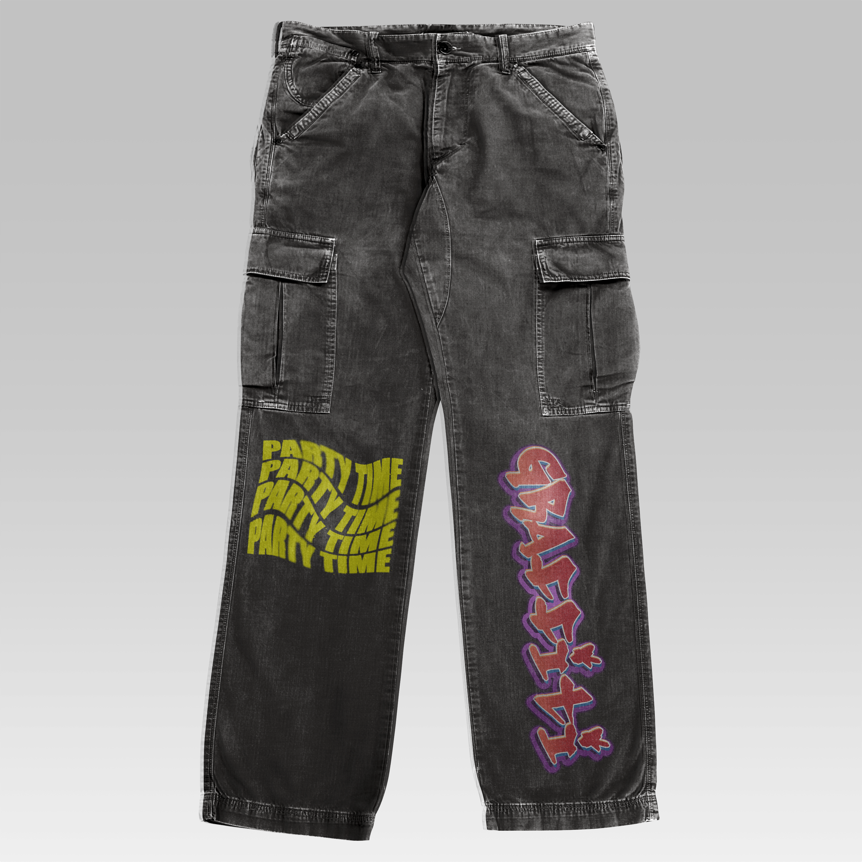This mockup features a pair of casual dark cargo pants displayed against a neutral gray gradient background. The pants are adorned with vibrant graphic designs: "PARTY TIME" is repeated in wavy yellow text on the left thigh, and "GRAFFITI" is styled in colorful graffiti-like text along the right leg. Ideal for advertising custom apparel, showcase your brand's creativity by using this mockup generator. Share your unique design on social media now!