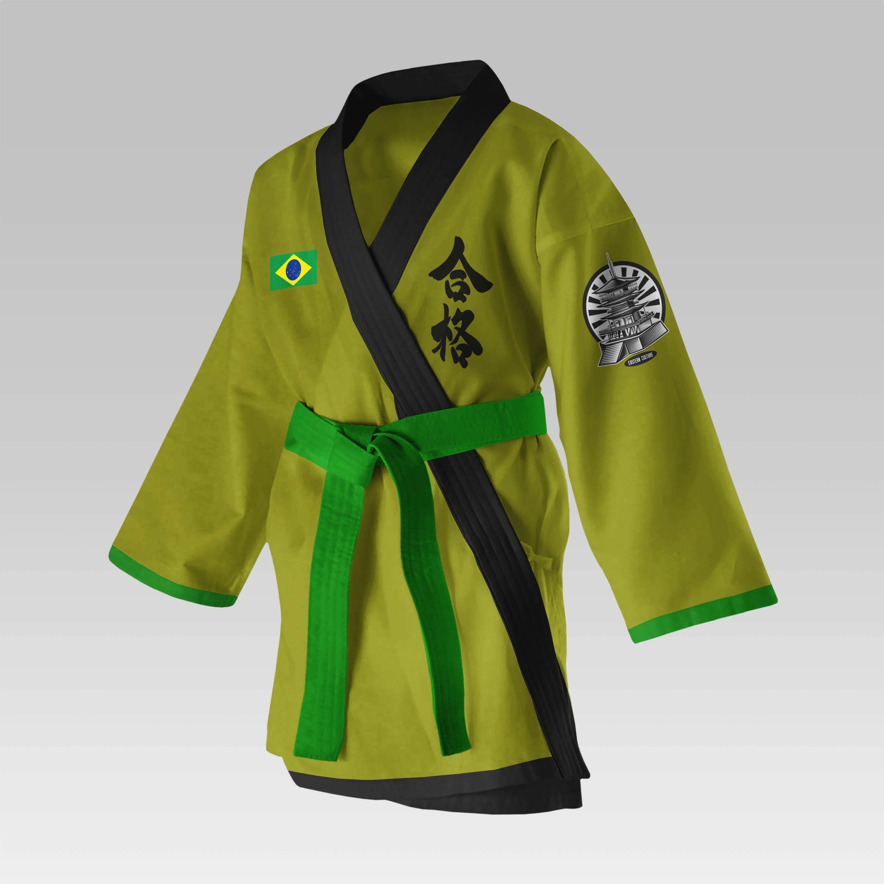 A green and black martial arts gi mockup with a Brazilian flag patch and a black belt displayed on a grey background.