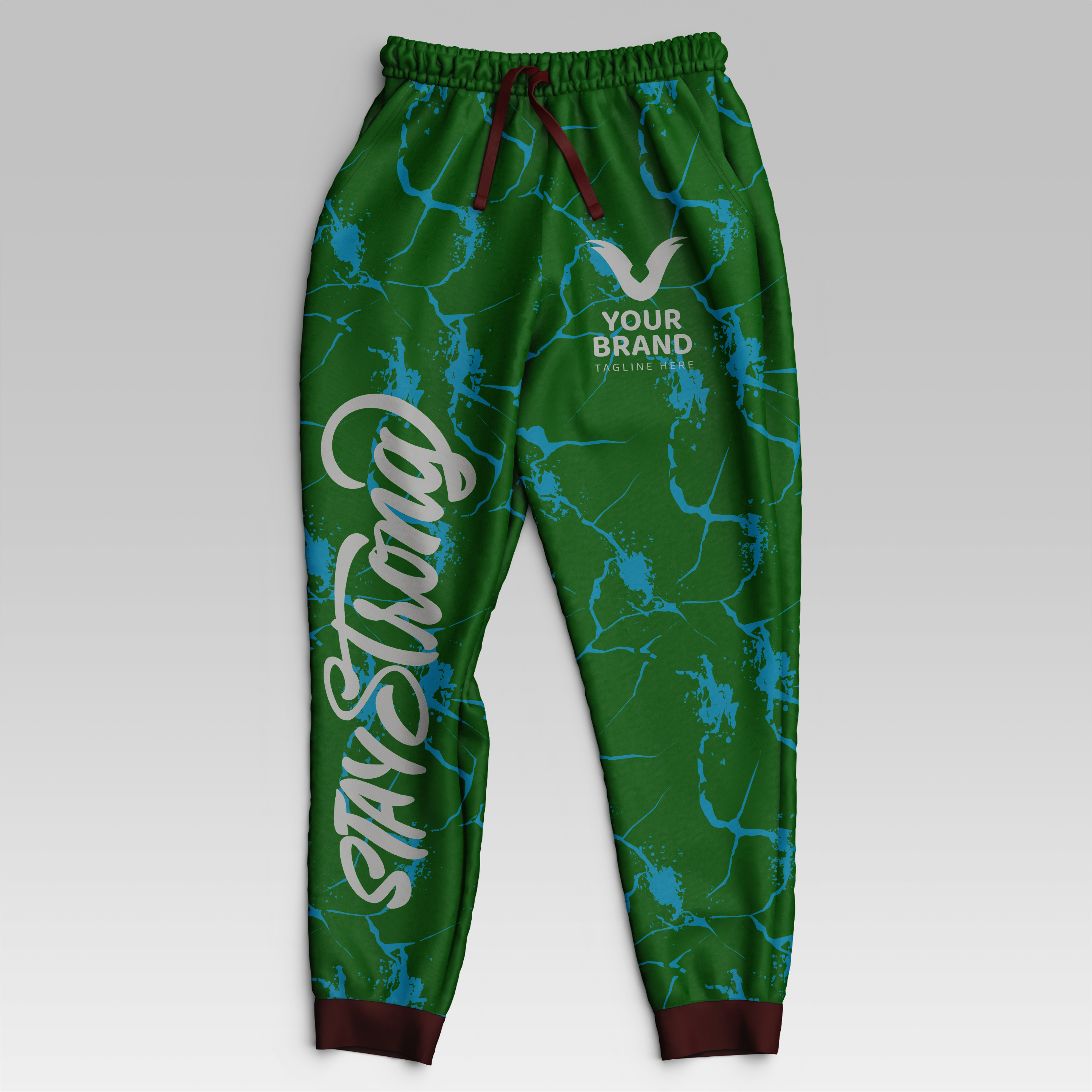 The mockup image features a pair of green jogger pants with an energetic blue splash pattern. The pants have an elastic waistband with red drawstrings and red cuffs at the bottom. The design includes bold, white, graffiti-style text vertically down one leg and a branded logo on the upper thigh. The background is a simple gradient from light grey to white, keeping the focus on the joggers. Use this mockup to showcase your custom apparel designs and generate interest on social media. Try the mockup generator now and share your creations online!