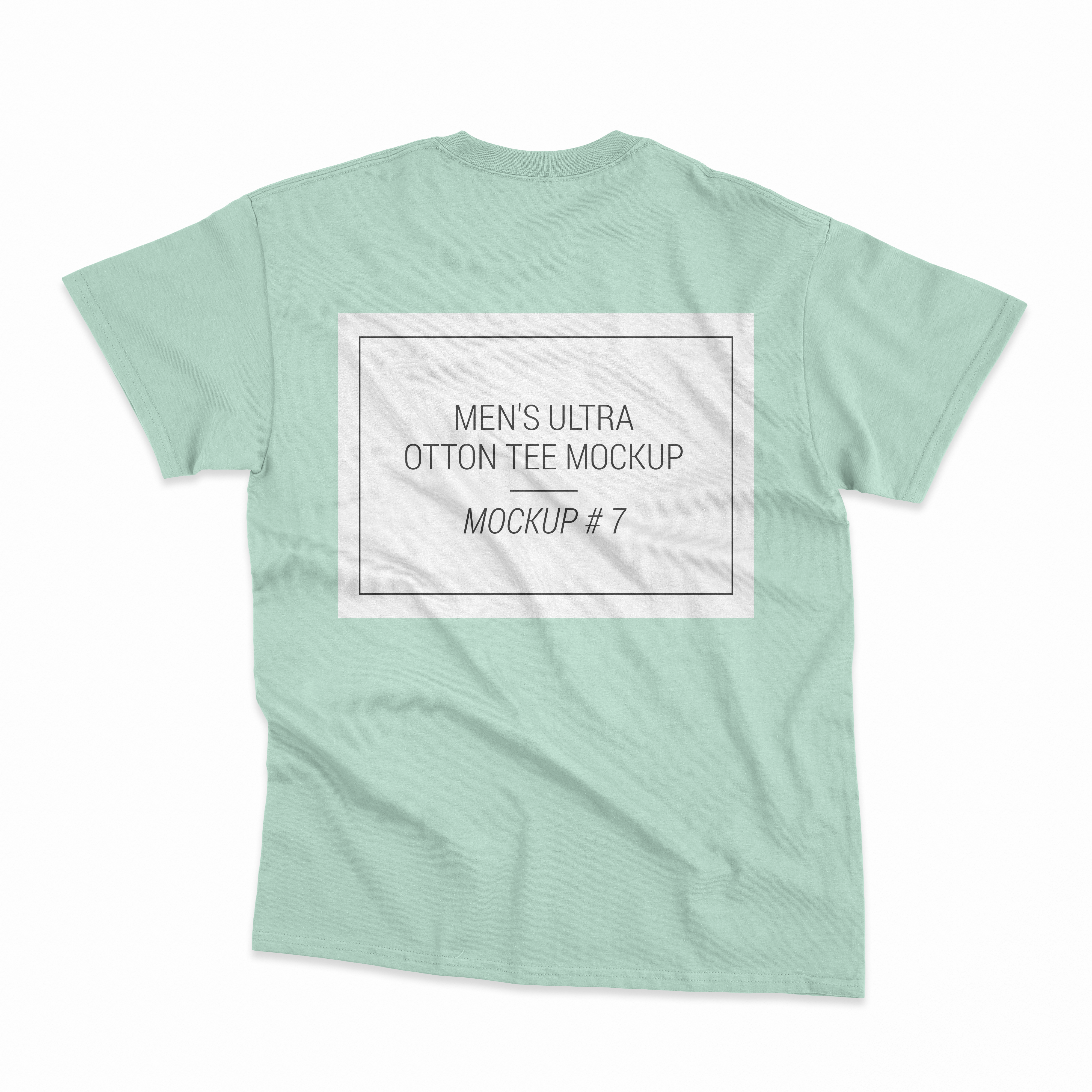 This mockup features a mint green men's T-shirt against a plain white background, highlighting the shirt's back. The design includes a simple rectangular frame centrally placed on the back, perfect for showcasing logos or custom artwork. Use this mockup for effective advertising by visualizing your brand's T-shirt designs. Ready to bring your ideas to life? Use the mockup generator and share your unique design on social media today!