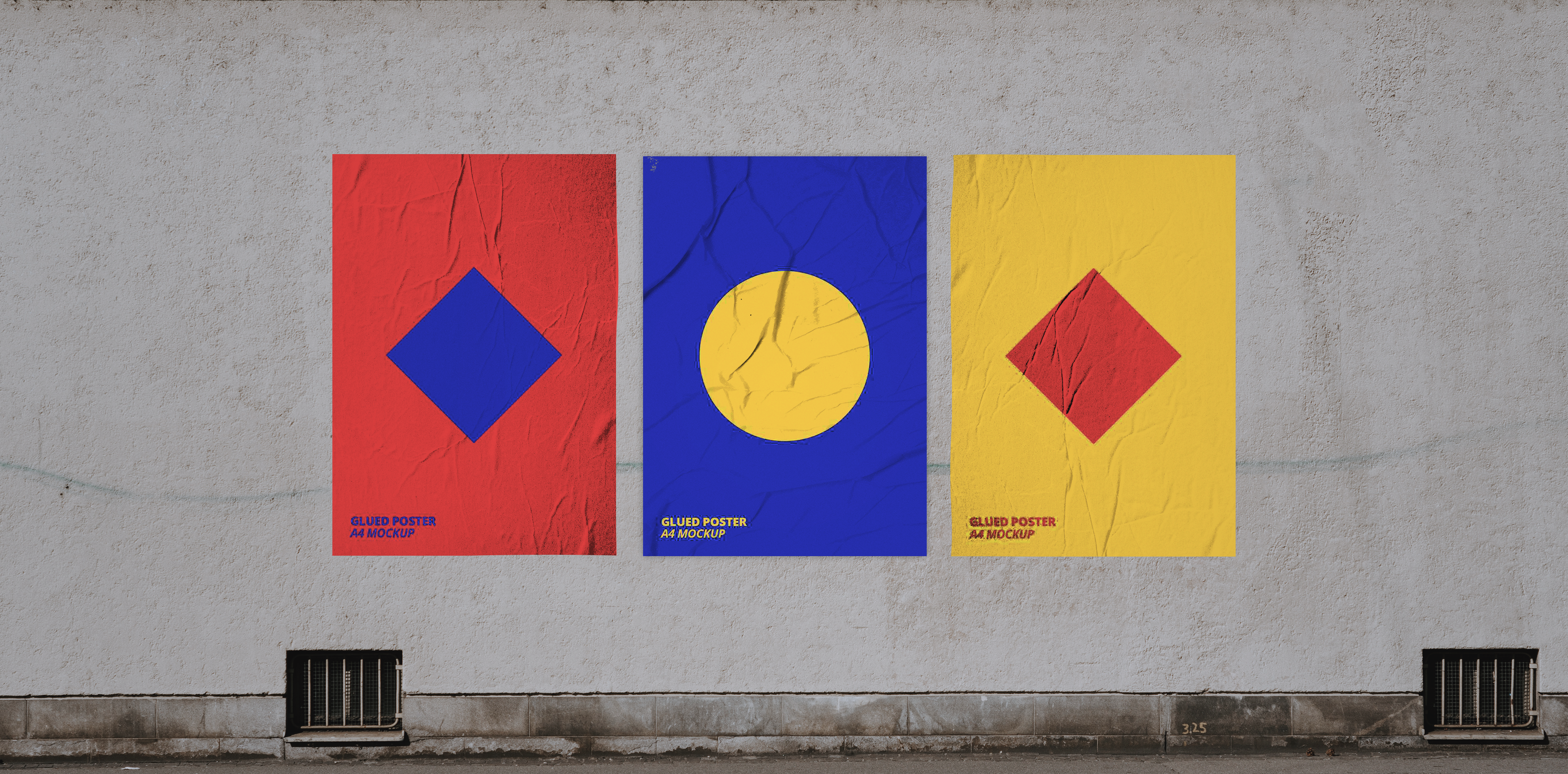 The mockup image depicts a trio of posters affixed to a weathered concrete wall with two small vents at the bottom. The posters feature bold geometric designs: a blue diamond on a red background, a yellow circle on a blue background, and a red diamond on a yellow background. This vibrant, eye-catching setup is ideal for showcasing your poster designs or advertising campaigns. Utilize this mockup generator to visualize your creativity and share the compelling designs on social media to captivate your audience!