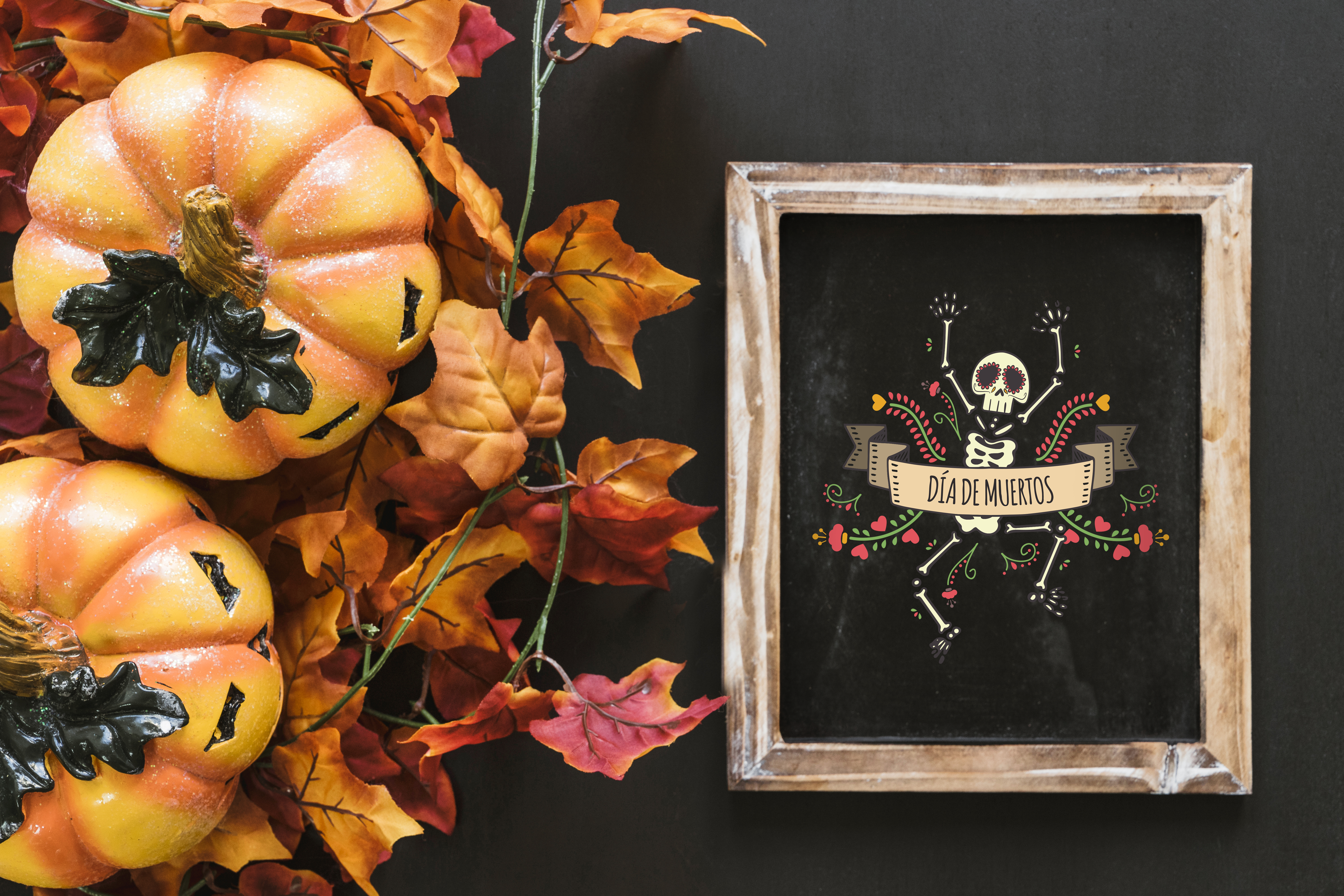 This mockup features a festive setting with a rustic wooden frame on a dark background, surrounded by vibrant autumn leaves and decorative pumpkins. The frame showcases a lively Día de Muertos design, including a colorful skeleton and floral elements. This mockup is ideal for advertising seasonal events, decorations, or holiday promotions. Create your custom designs using this mockup generator and share your unique creations on social media today!