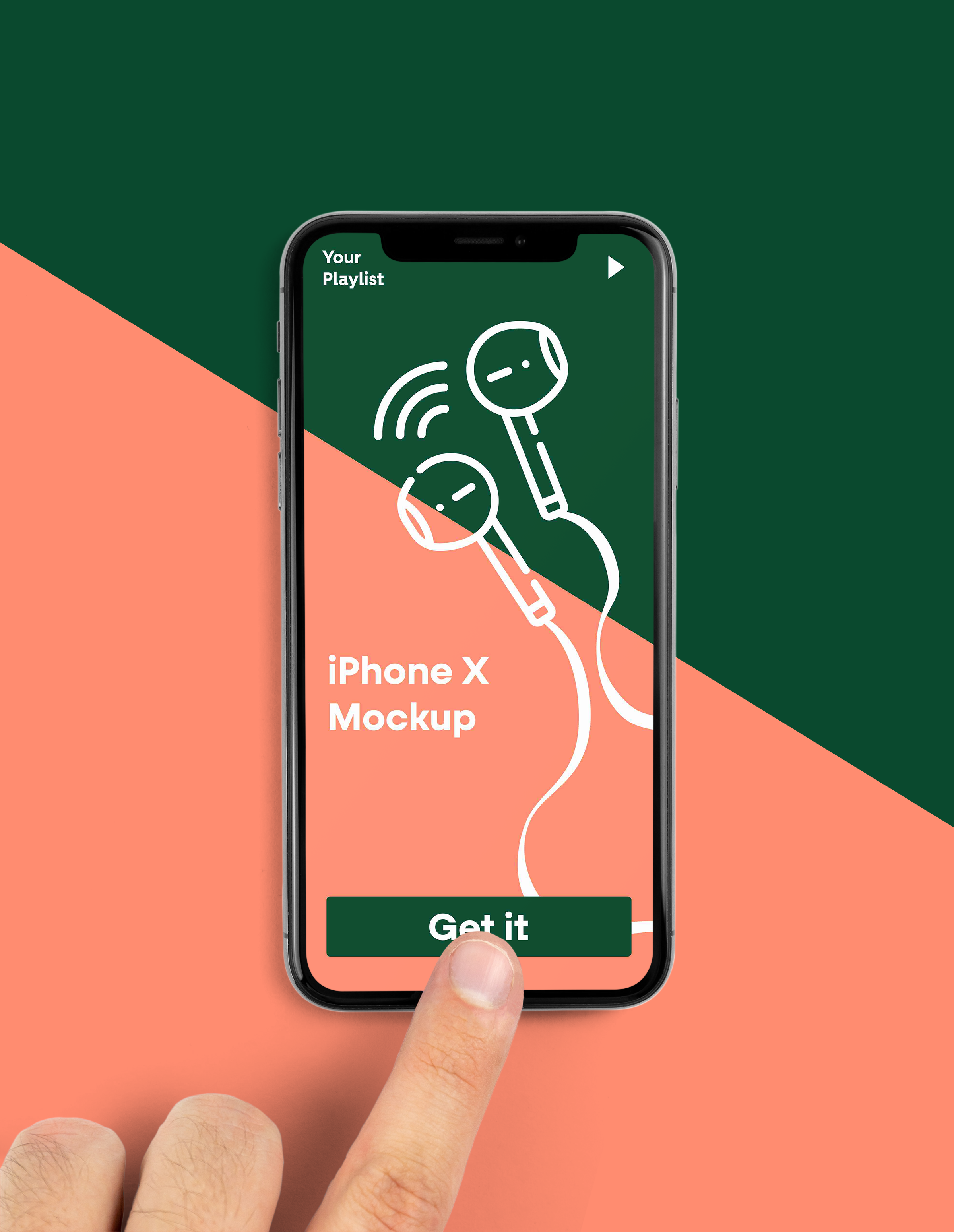 This mockup image features an iPhone X against a diagonal green and peach background. The phone displays a graphic of white earphones and a "Get it" button. A hand is poised to tap the screen, adding a sense of interactivity. Use this mockup for promoting mobile apps, services, or products, showcasing their interface and features. Create your design using our mockup generator and share it on social media to engage your audience and drive interest in your offerings!