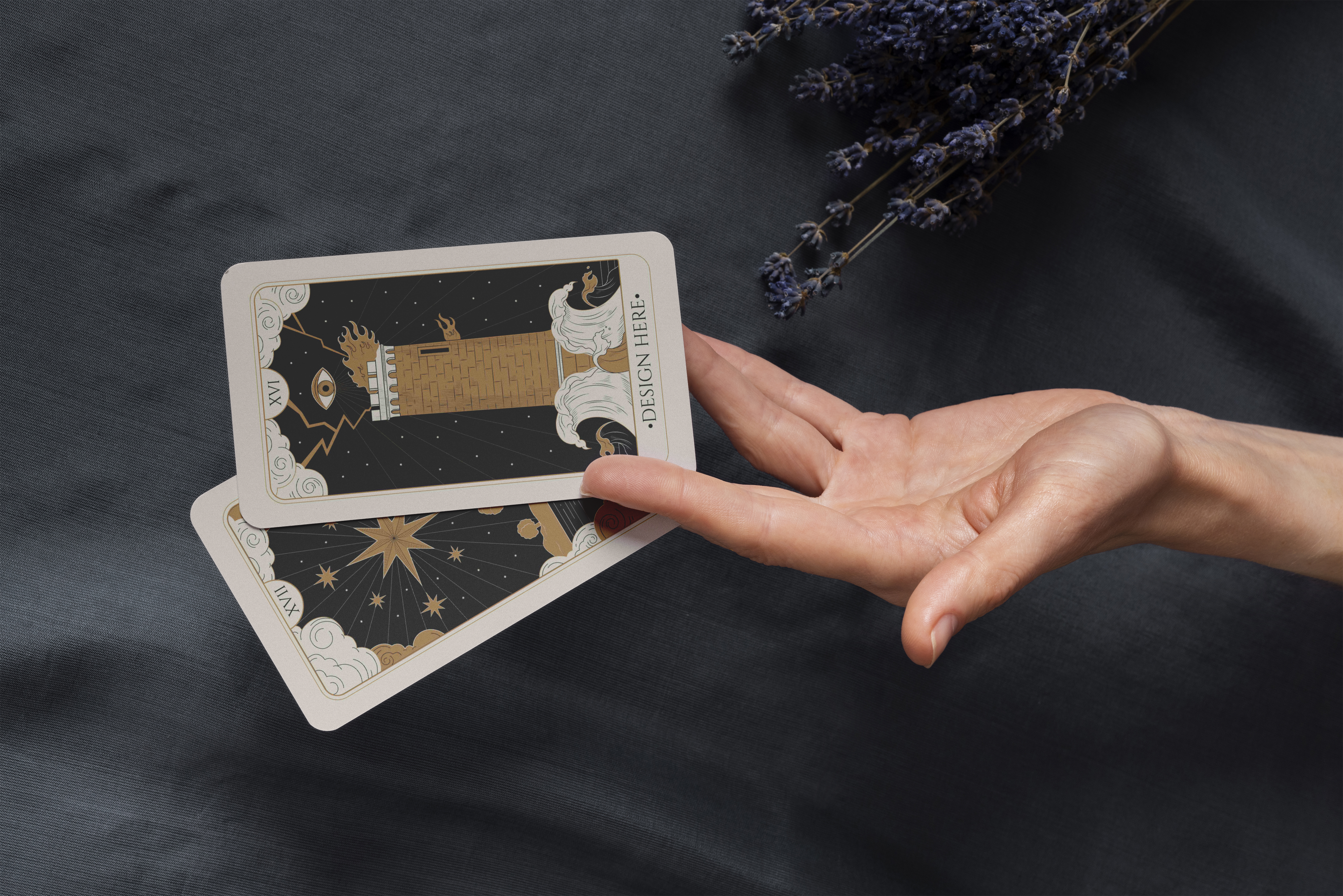 The mockup features a hand gracefully holding two tarot cards against a dark textile background, with sprigs of lavender nearby, creating a mystical ambiance. The cards showcase intricate designs with gold accents and celestial motifs. Use this mockup to advertise your tarot card designs, offering a visually appealing presentation. Utilize our mockup generator to create stunning visuals and share your unique designs on social media. Unleash your creativity today!