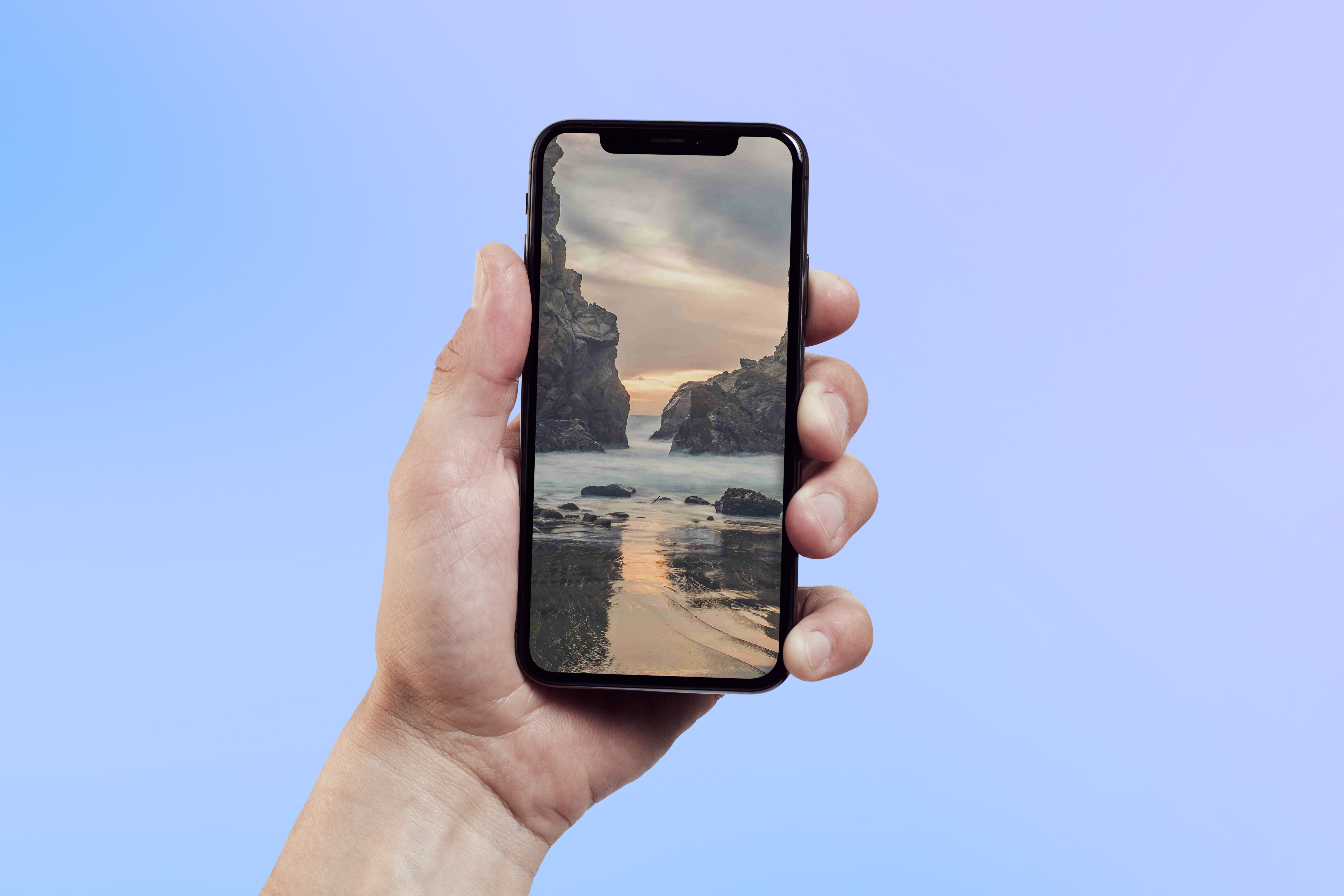 The mockup image features a realistic hand holding a modern smartphone against a gradient background transitioning from light blue to lavender. The phone screen displays a serene beach scene with rocky cliffs, calm waters, and a pastel sunset sky. This mockup is perfect for advertising new mobile apps, showcasing scenic designs, or presenting digital art. Use this mockup generator to create stunning visuals for your product and share your captivating designs on social media for maximum impact!