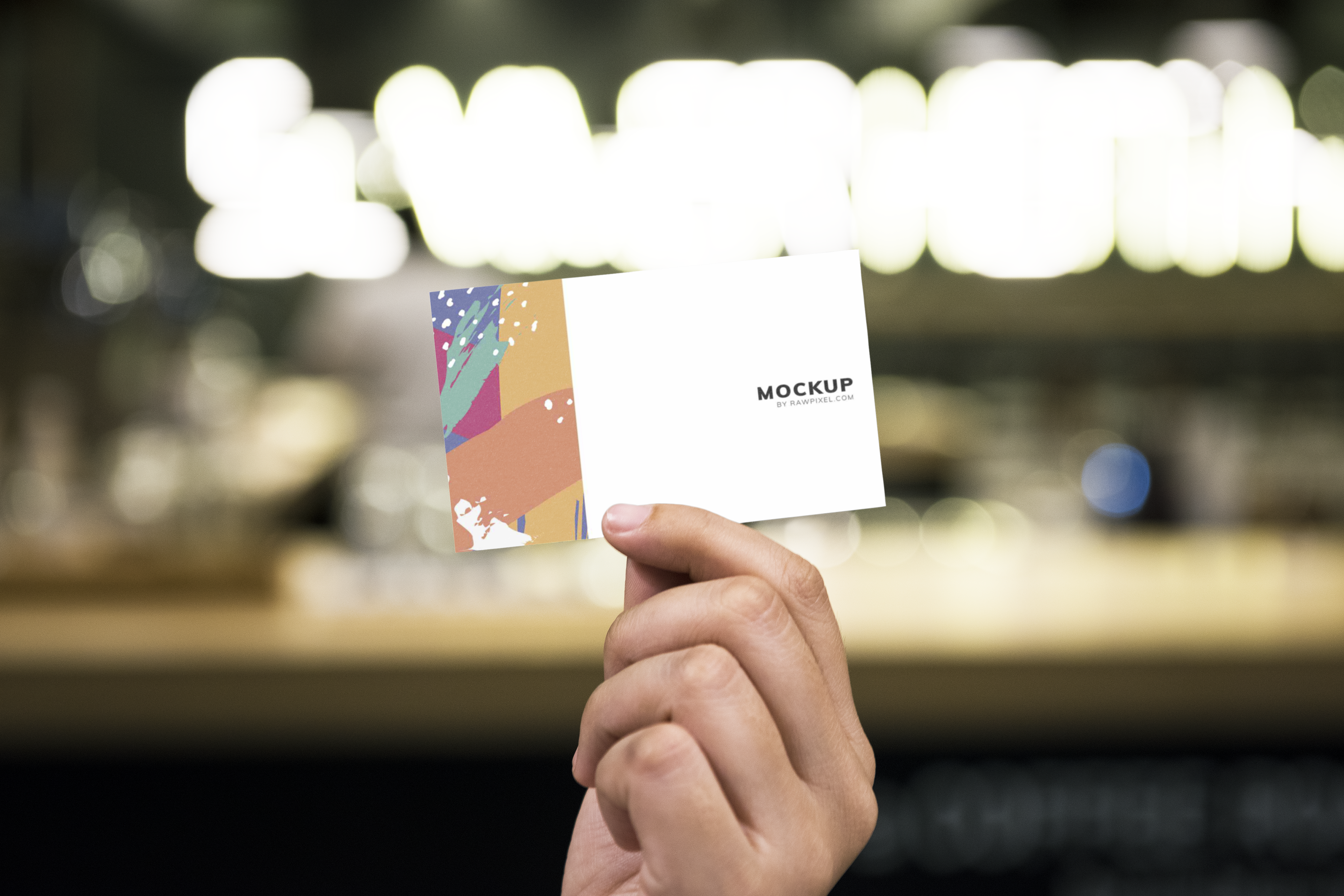 The mockup image showcases a hand holding a business card against a blurred, busy background, likely in a café or restaurant. The business card features a colorful abstract design on one side and a plain white side for text. This mockup is ideal for advertising business cards, event invitations, or promotional materials. Use the mockup generator to create your design and share it on social media to engage your audience and promote your brand effectively.