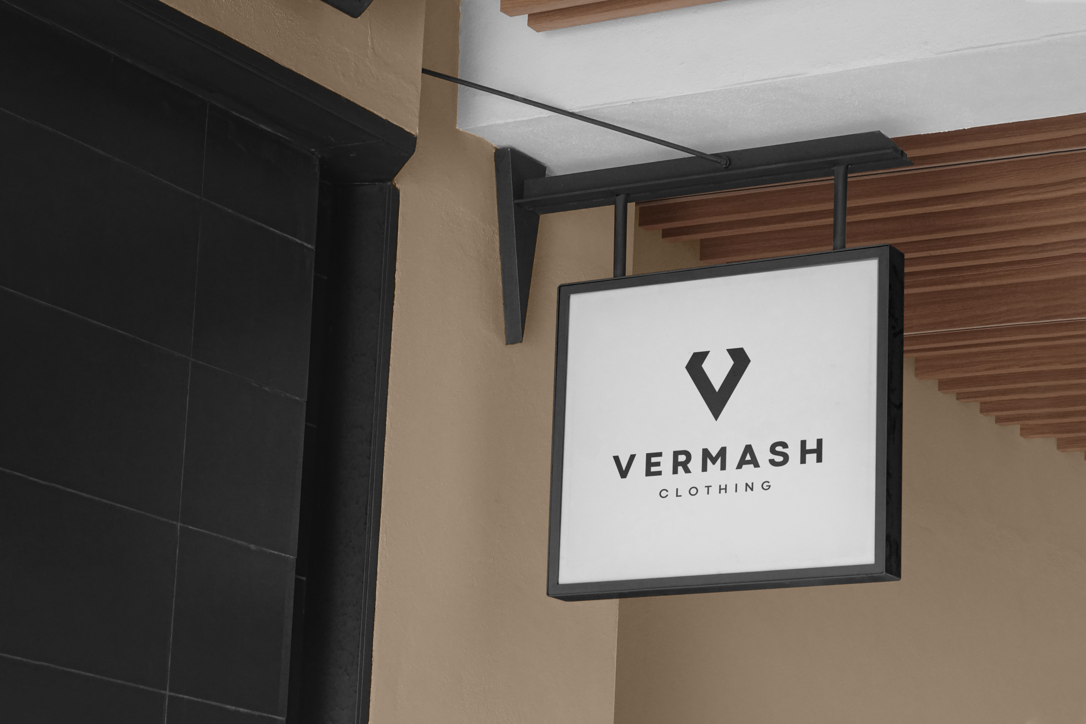 A hanging rectangular black and white store sign mockup with the logo "v" and the word "vermash" displayed on a building facade.