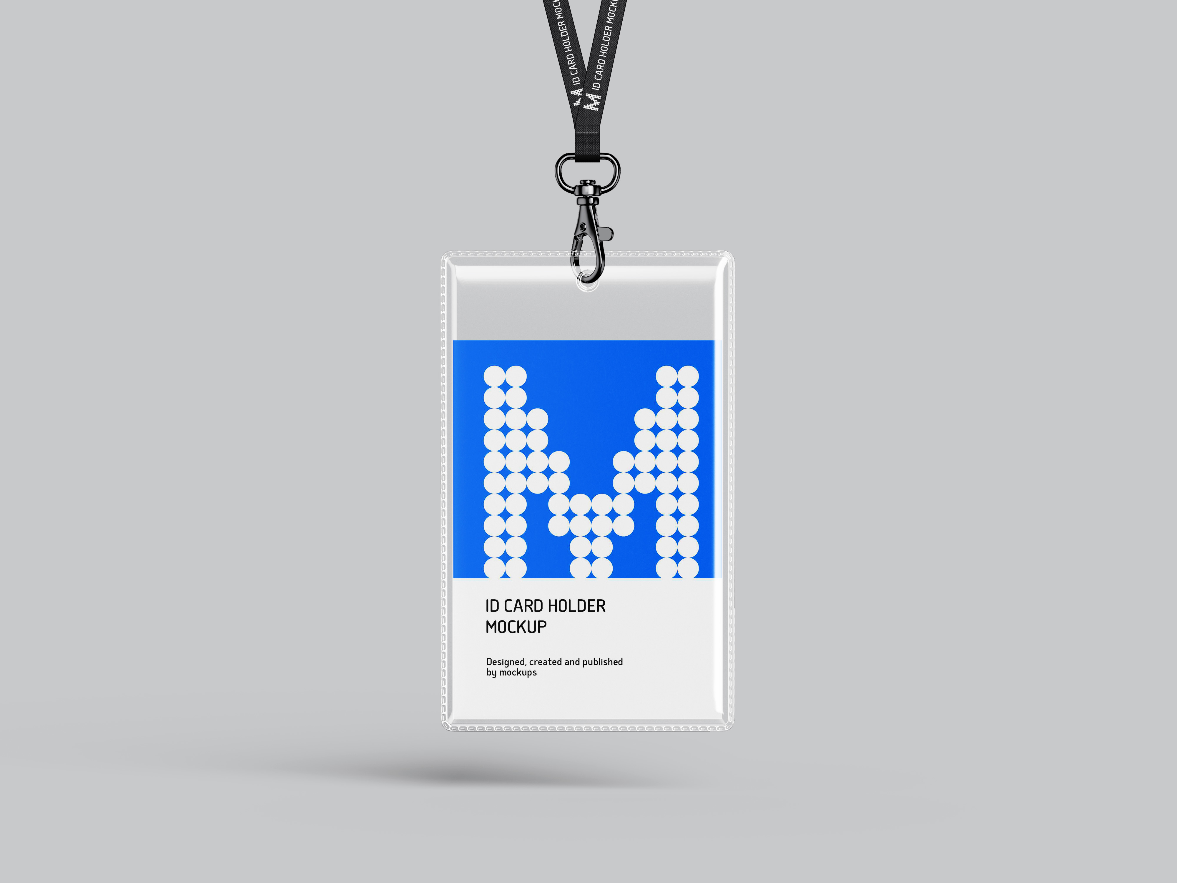 A lanyard displays a rectangular badge mockup featuring a large blue "M" made of white squares, with text and a barcode below on a gray background.