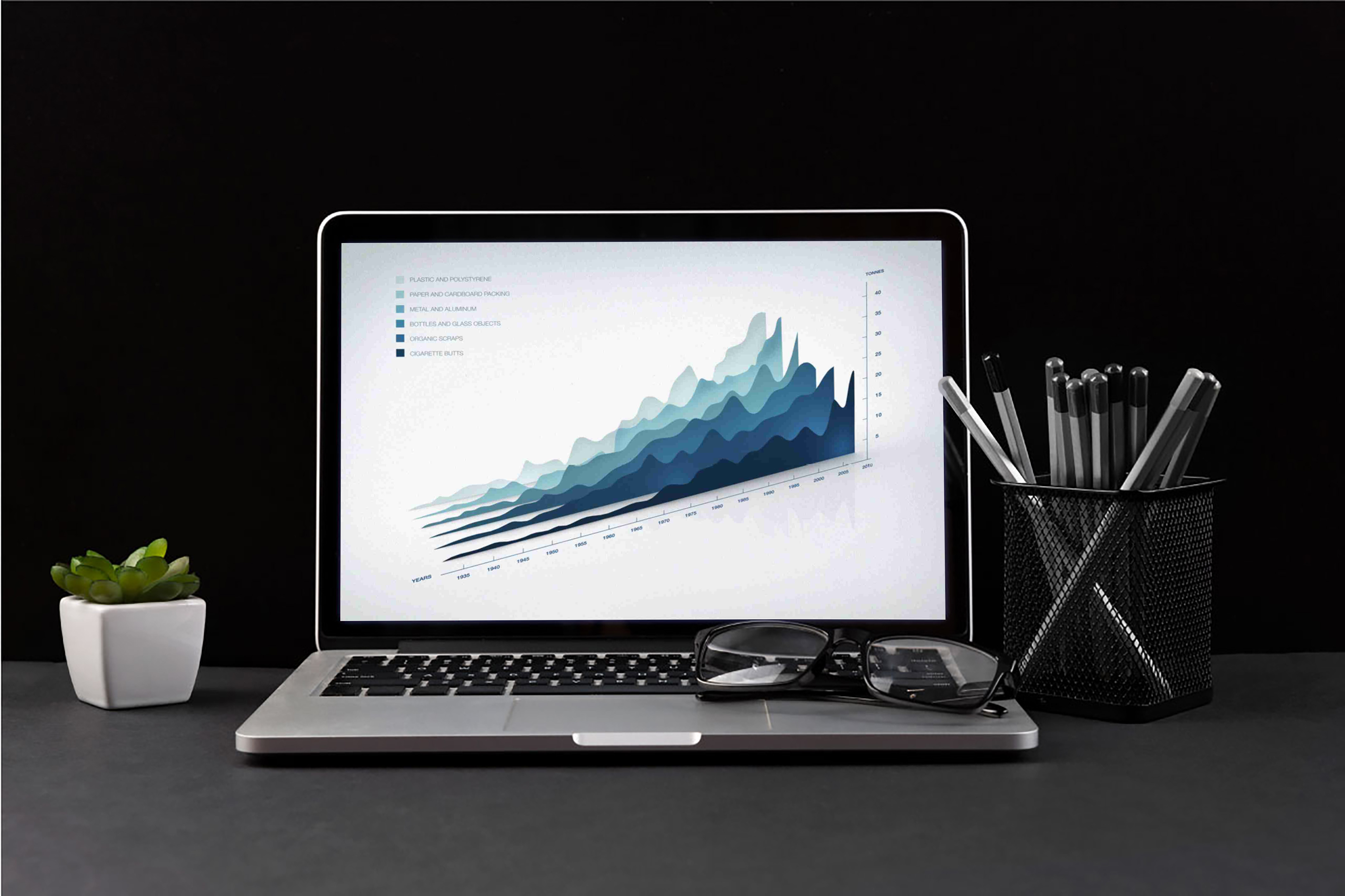 A laptop displaying a 3D bar graph serves as a perfect mockup, complemented by a game controller and pen holder on the dark desk.