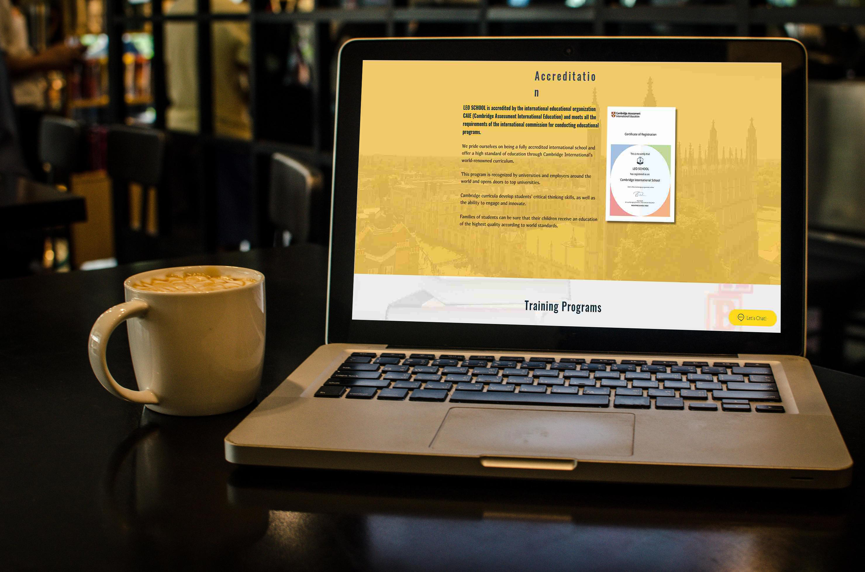 The image showcases a laptop on a café table with a coffee cup beside it. The screen displays a webpage with a yellow background, organized text, and a certificate design. The setting includes a blurred indoor café scene with patrons in the background, contributing to a cozy atmosphere. Use this mockup to advertise educational content, business services, or digital products. Try our mockup generator today and share your unique designs on social media!