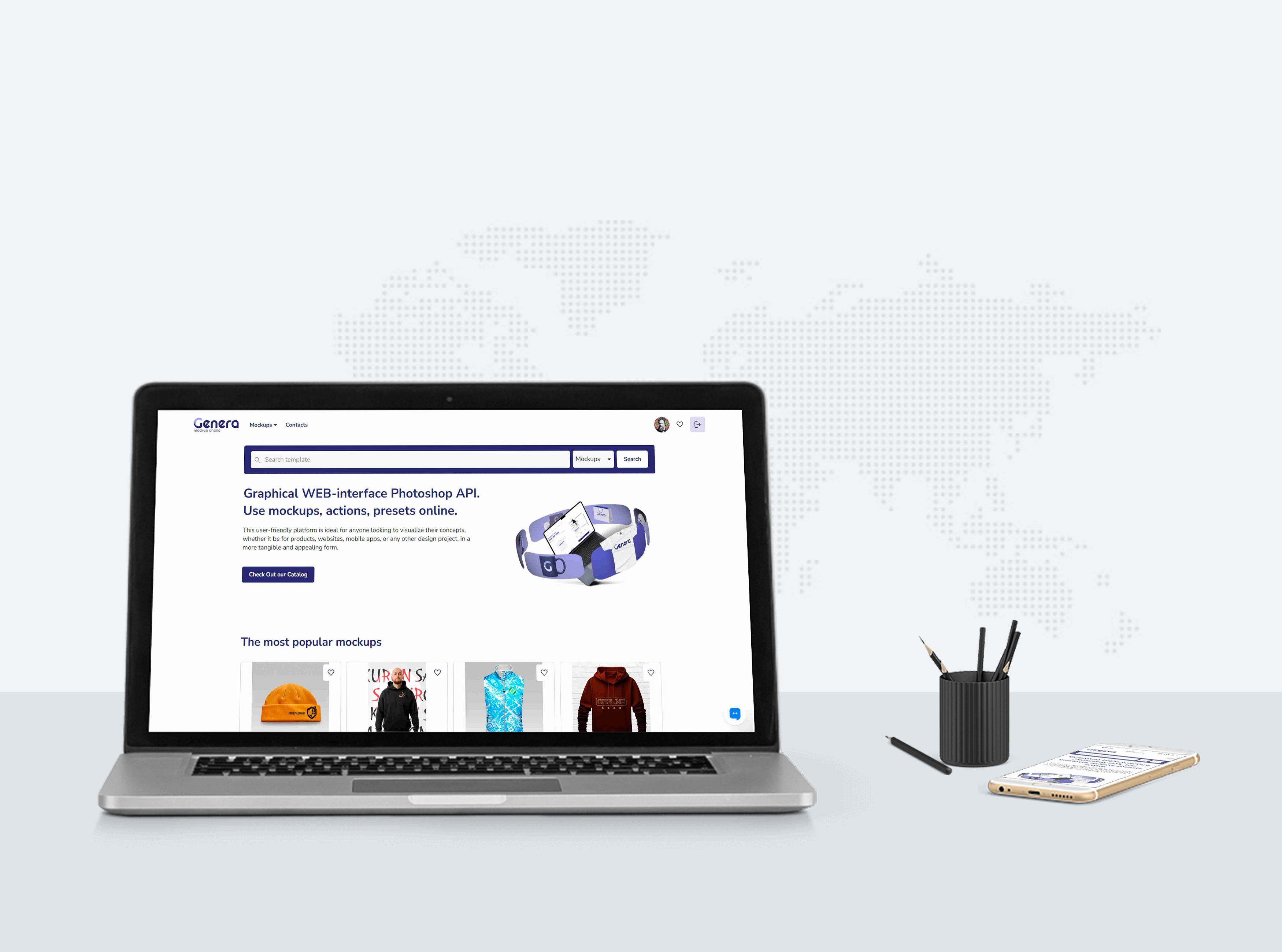 This mockup image showcases a sleek workspace featuring a laptop as the main object, displaying a website interface. The background is a light grey with a subtle world map graphic. The laptop is accompanied by a smartphone, a cup holding pens, and a stylus pen on a clean desk. This setup is ideal for advertising digital products or services, demonstrating a clean and professional online presence. Try the mockup generator to visualize your designs and share them on social media for heightened engagement!