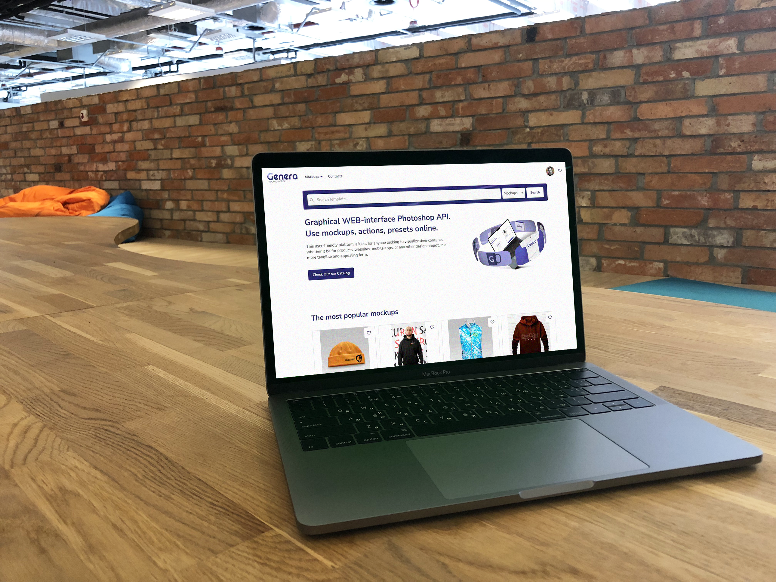 The image presents a modern workspace with a laptop placed on a light wooden table. The background features a stylish brick wall and casual seating with vibrant bean bags, creating a relaxed office atmosphere. The laptop screen displays a website interface, with clean design elements and mockup images.