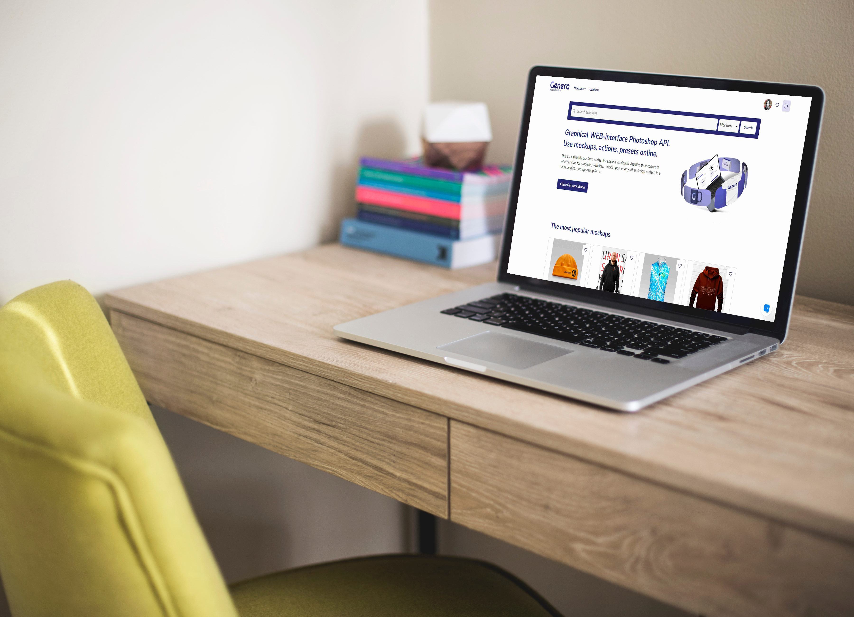 A laptop sits on a desk, alongside a yellow chair, in this mockup template.