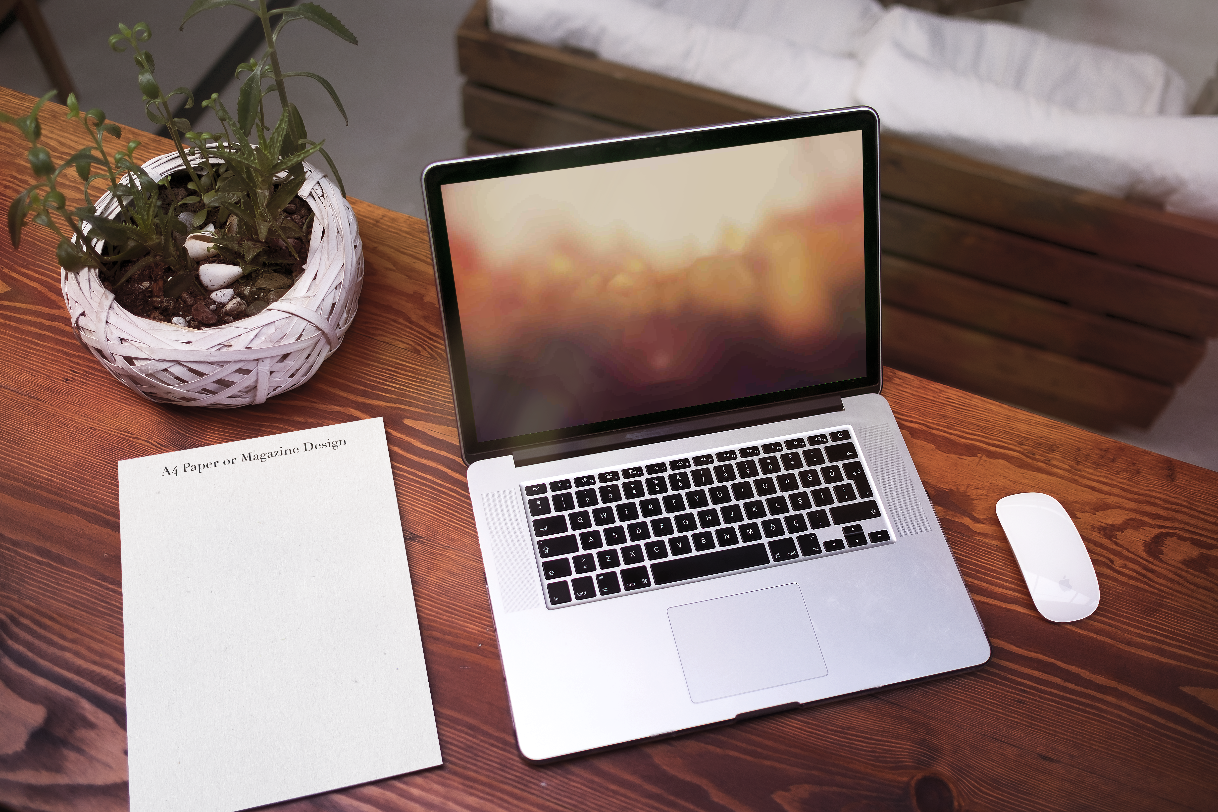The mockup image features a cozy desk setup with a warm, wooden table, a potted plant in a white wicker basket, and a modern laptop displaying a blurred screen. To the left is a sheet of A4 paper, and to the right, a wireless mouse. The background reveals a comfortable seating area with cushions. This mockup is perfect for showcasing digital and print designs in a professional yet inviting setting. Use this mockup generator now and share your stunning design on social media!