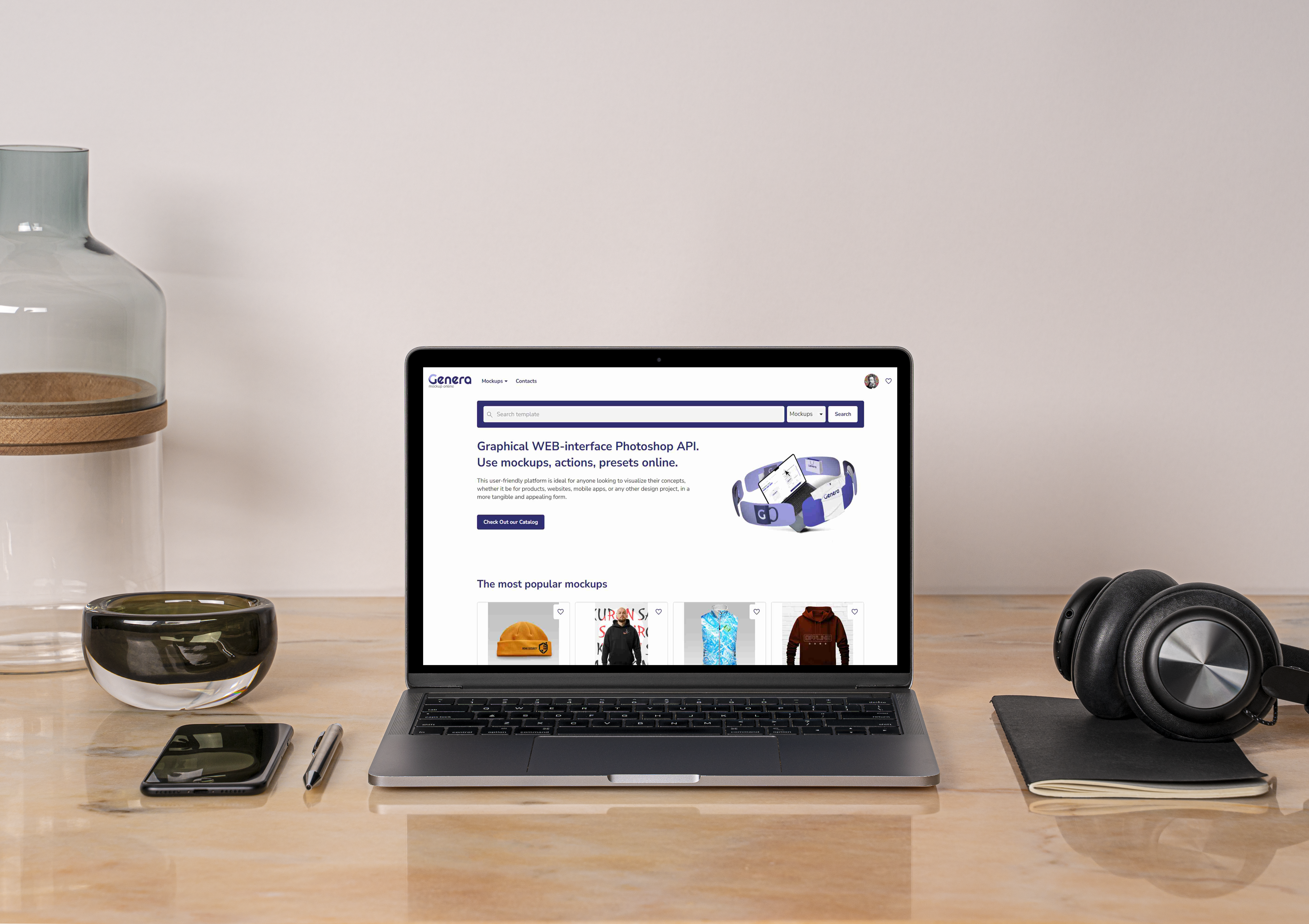 The mockup image features a modern laptop on a polished wooden desk, accompanied by a glass jar, bowl, phone, pen, notebook, and headphones. The minimalist setting with neutral background highlights the laptop displaying a design application interface. Use this mockup for advertising to showcase your digital workspace or creative projects with a professional touch. Ready to elevate your brand? Use the mockup generator now and share your stunning designs on social media!